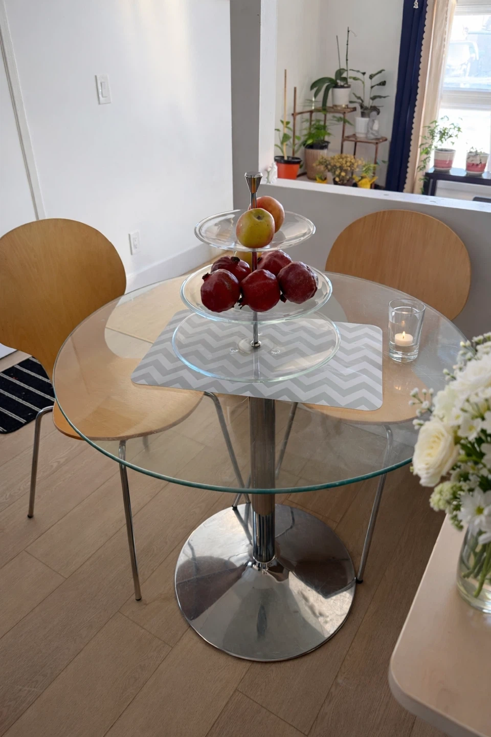 Selling a round glass dining table with two wooden chairs. It's in great condition and would be perfect for a small space or breakfast nook
