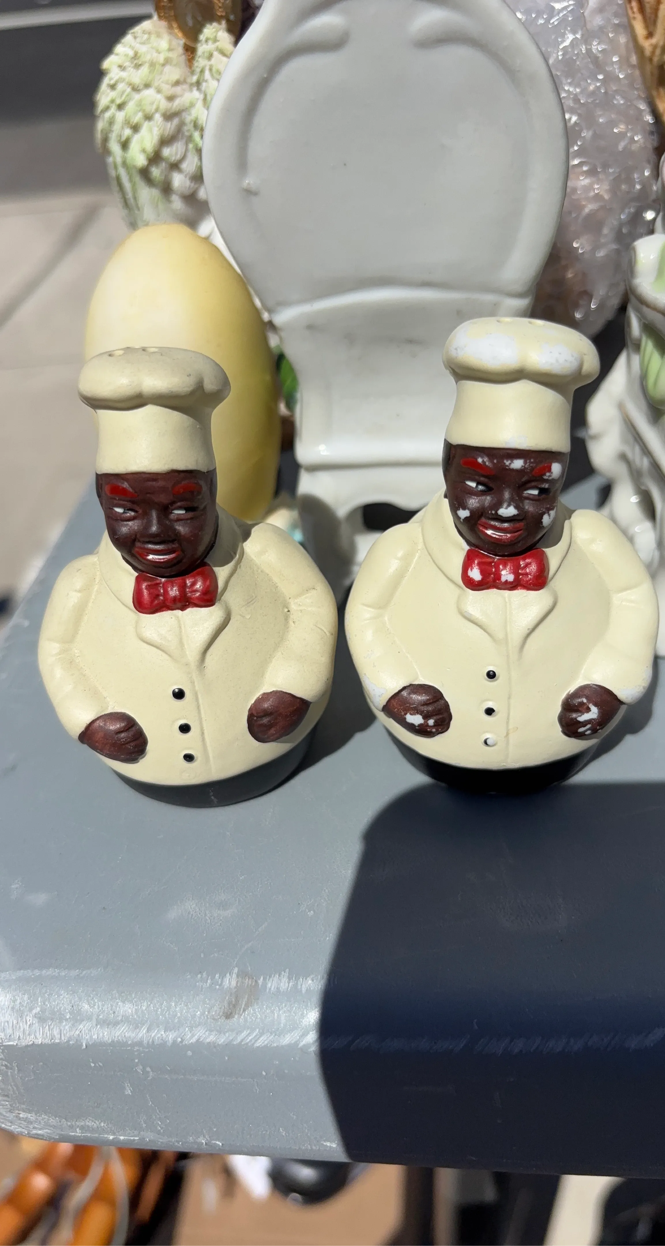 Cute set of two chef shakers, one for salt and one for pepper! They're made of ceramic and have a classic chef outfit design with a red bow tie. Perfect for adding a touch of whimsy to your kitchen or dining table!