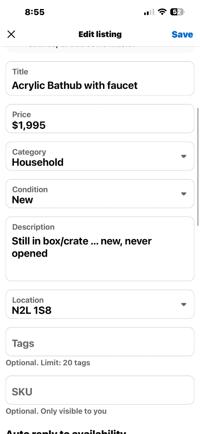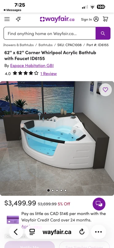 Still in box/crate, new and never opened. This acrylic bathtub is 62 inches by 62 inches and features a whirlpool system with a faucet. It's designed for corner installation.