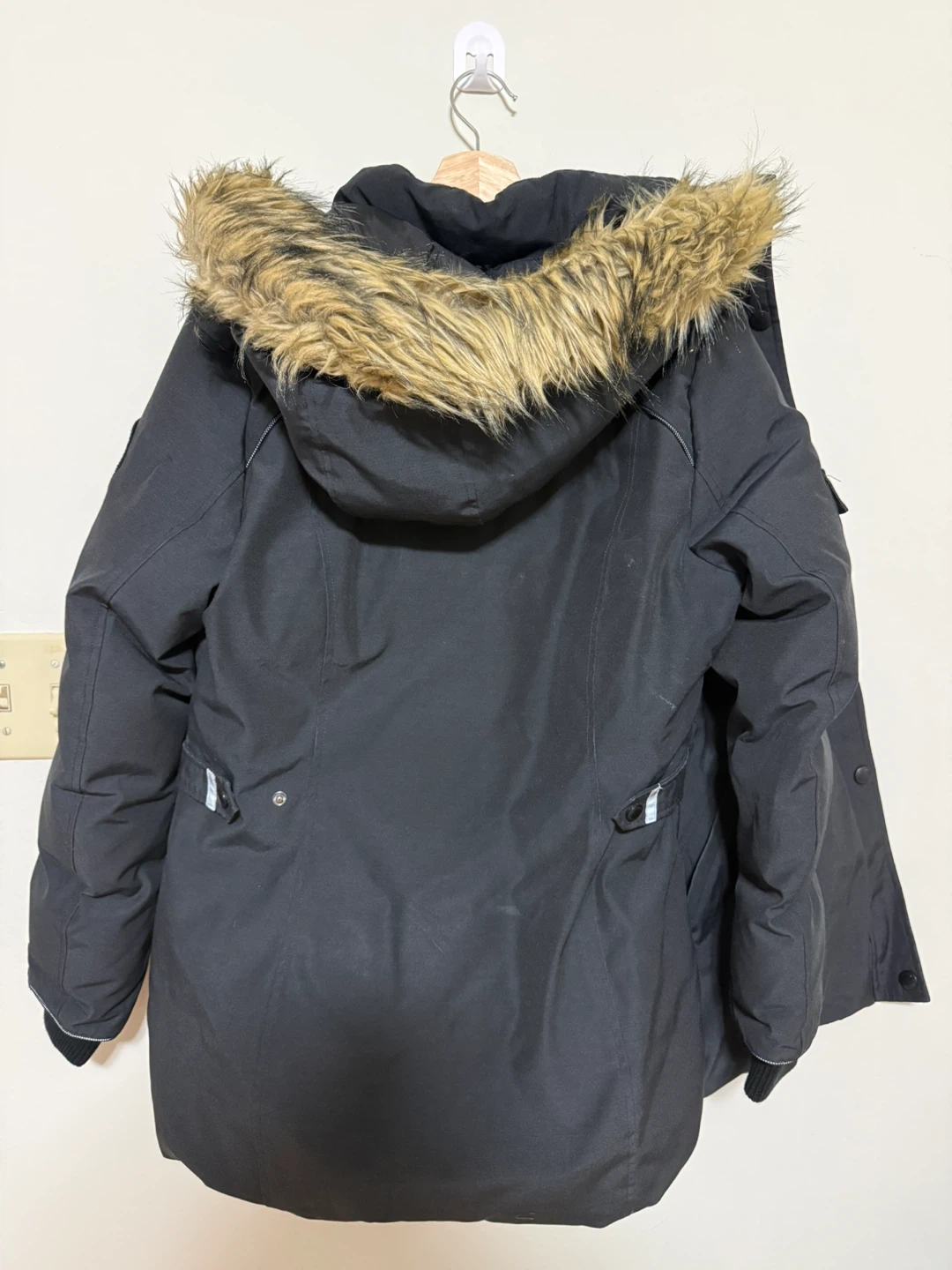 This black winter parka features a faux fur-lined hood and a durable shell. It's designed for cold weather with a full zip and button closure. Keep warm and stylish this season!