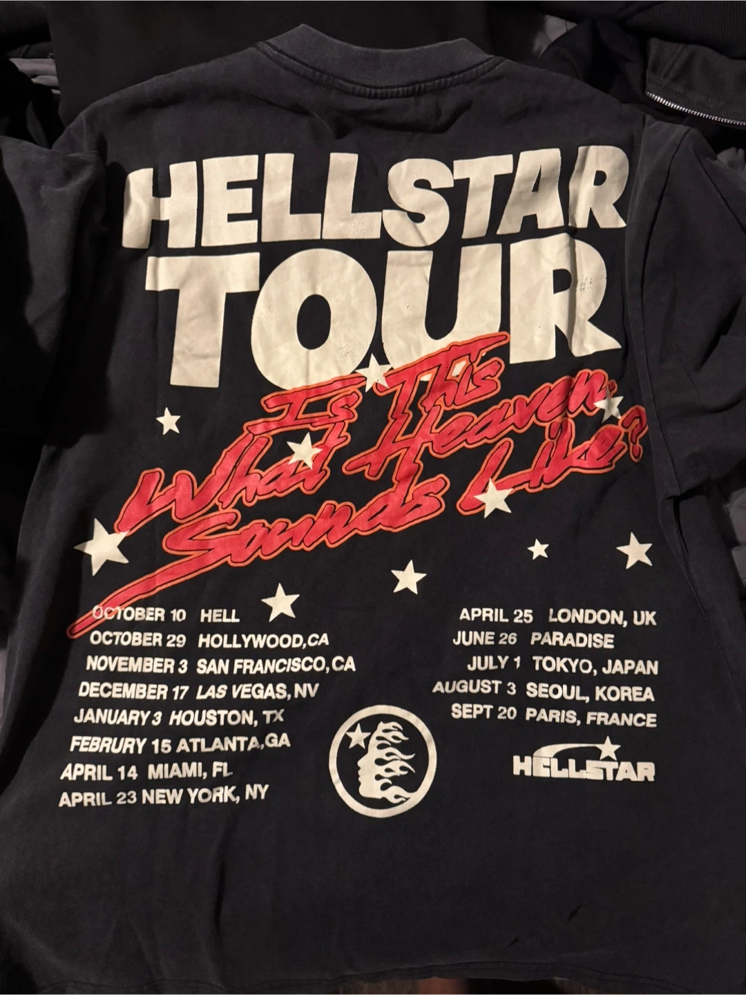 Black Hellstar short-sleeved t-shirt with "Path to Paradise" graphic and tour dates on the back. Made with cotton material. Features "Is This Heaven What Sounds Like?" print. Great for fans of the brand.