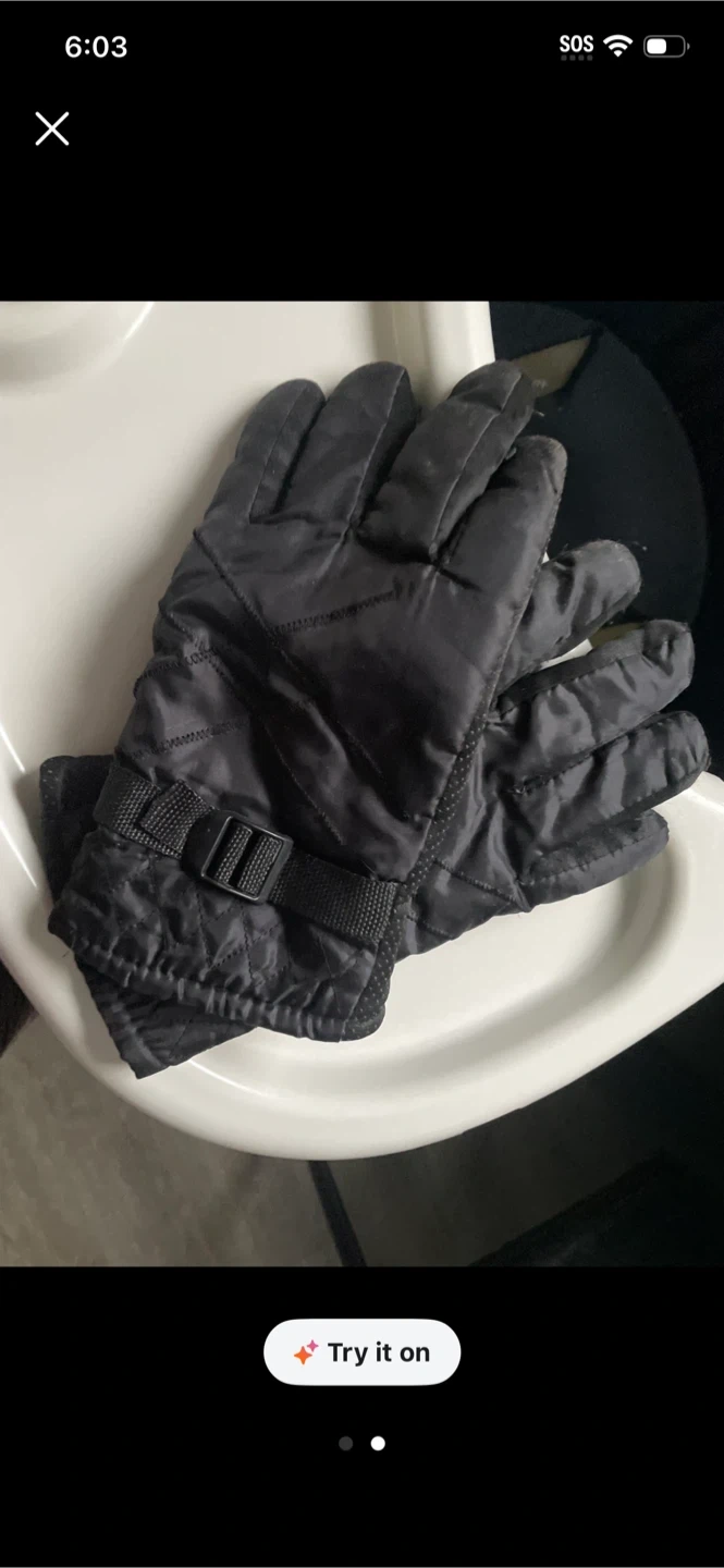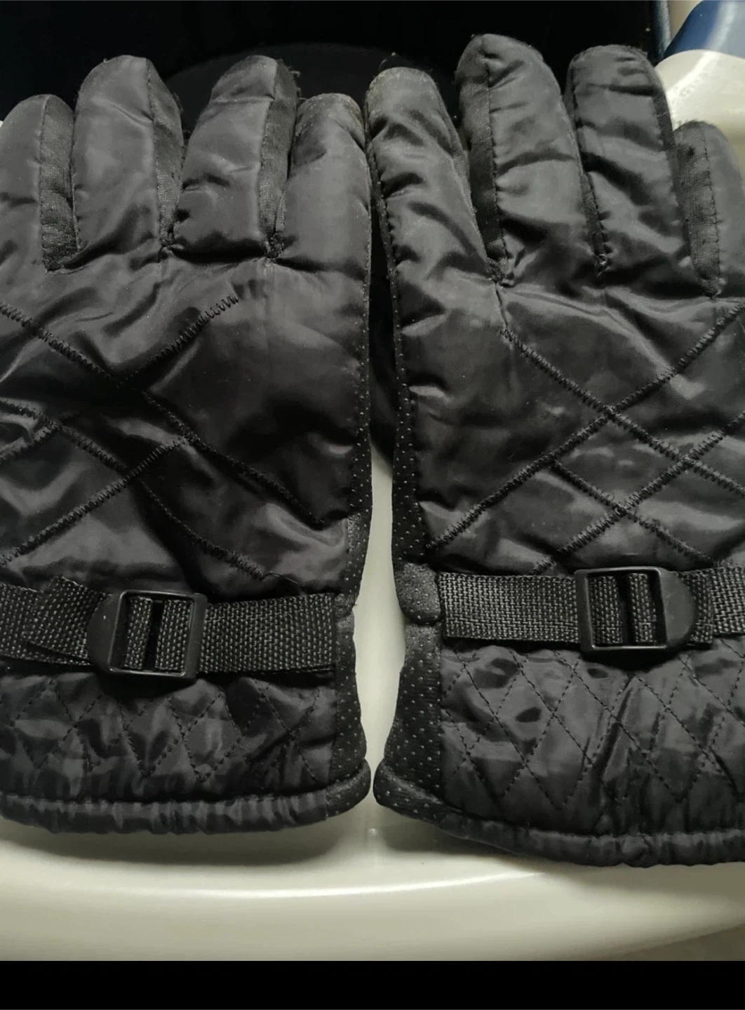 Warm black quilted winter gloves. They have adjustable wrist straps for a snug fit. The palms have a grip texture. These gloves are great for keeping your hands toasty on cold days!