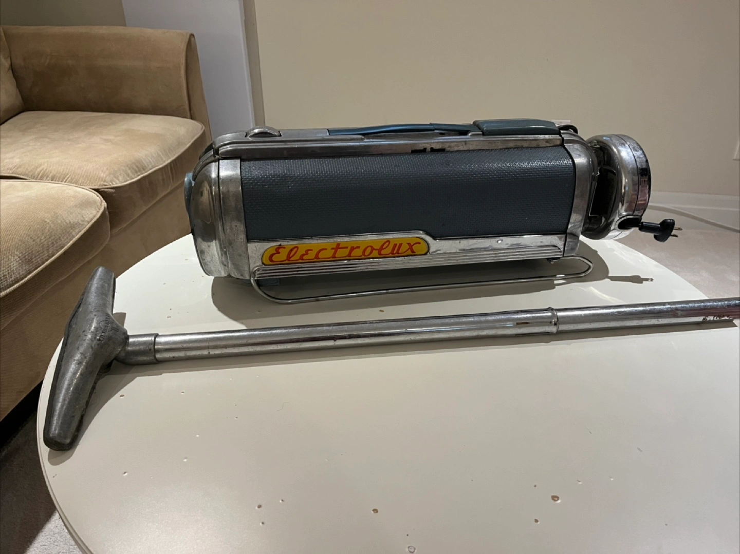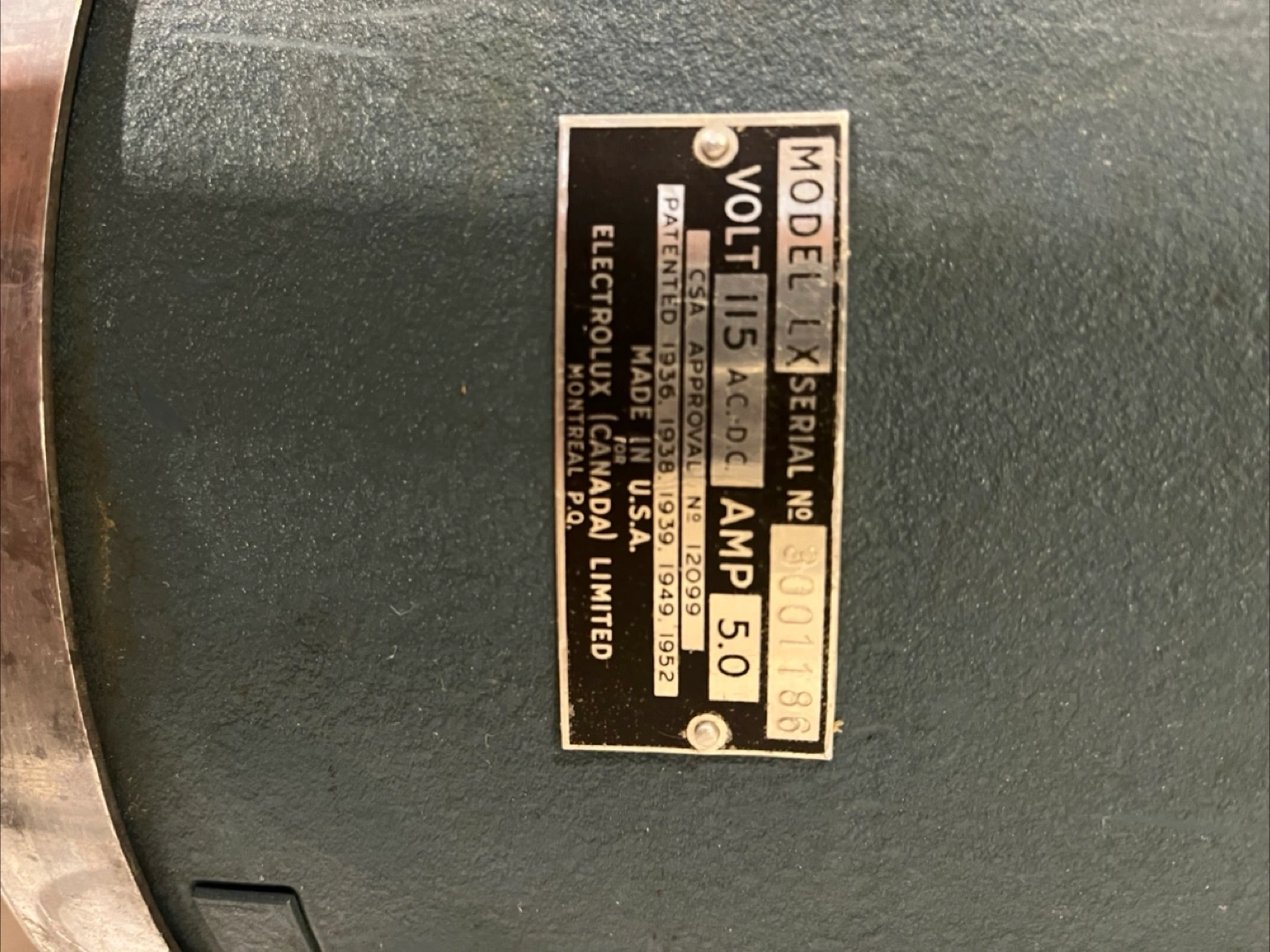 Selling a vintage Electrolux LX vacuum cleaner. It's in used condition, as you can see in the photos. The model LX has a serial number of 80001186. It operates at 115 volts AC-DC and 5.0 amps. Missing hose and handle is broken. Not sure if it still works.
