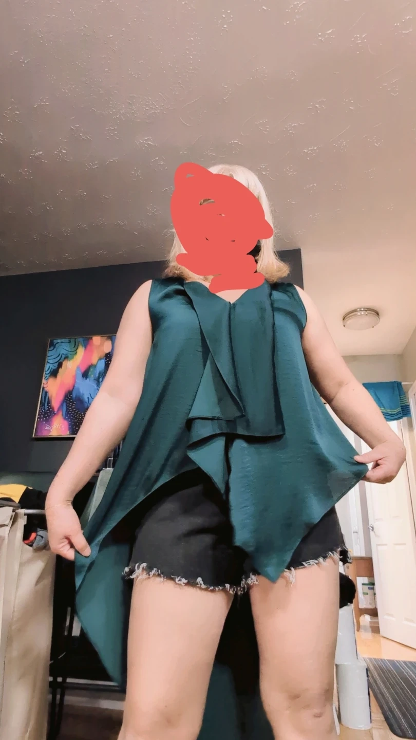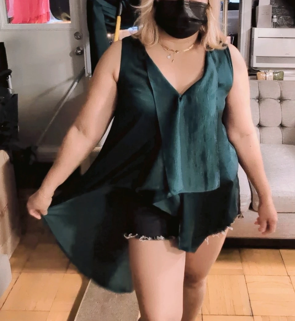This sleeveless top features a V-neck and a flowy high-low hemline. It's made of a silky material in a rich teal colour. The cascading ruffles add a touch of elegance. This top is great for dressing up or down!