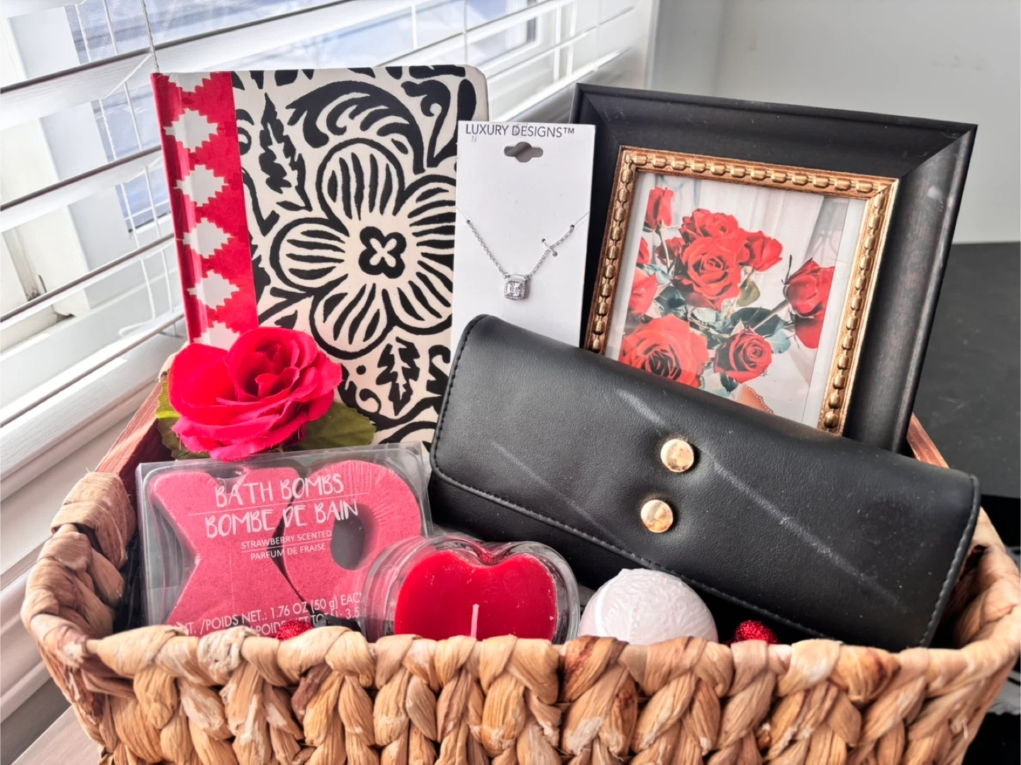 This gift basket includes strawberry scented bath bombs, XO Bath Bomb, Notebook, Decorative Frame and a heart shaped candle.
