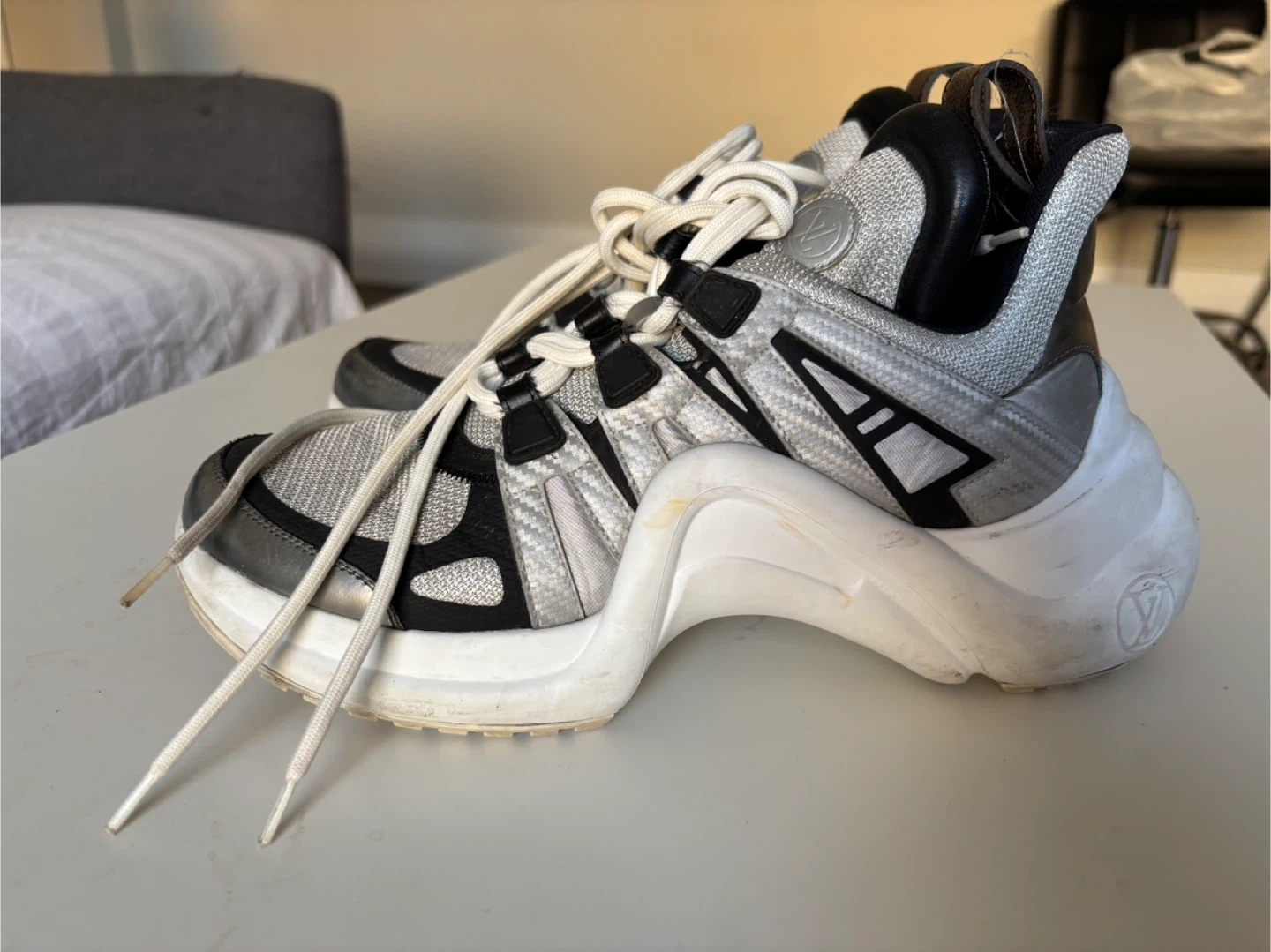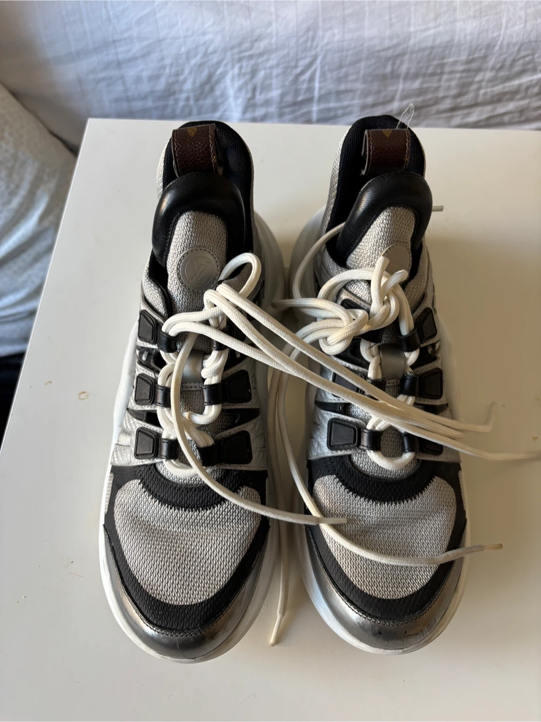 Louis Vuitton Archlight sneakers in silver and black. These statement shoes feature a chunky white sole and signature LV branding. They're a unique addition to any footwear collection!