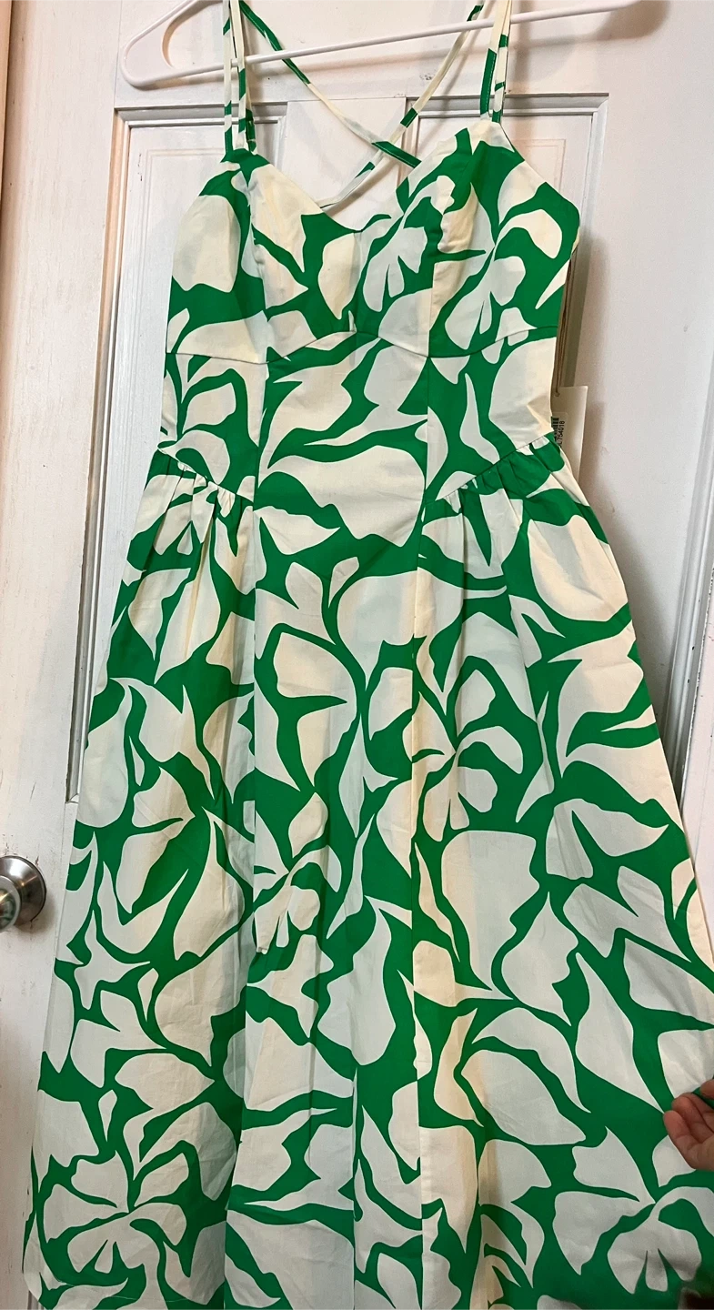 This dress features a bold green and white floral print. It has adjustable straps and a smocked back for a comfortable fit. Two side pockets included!