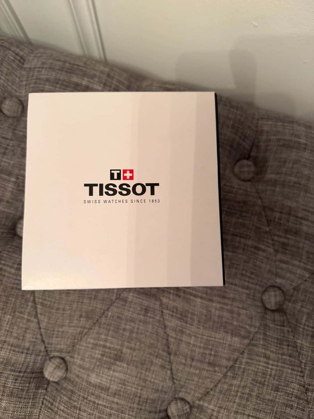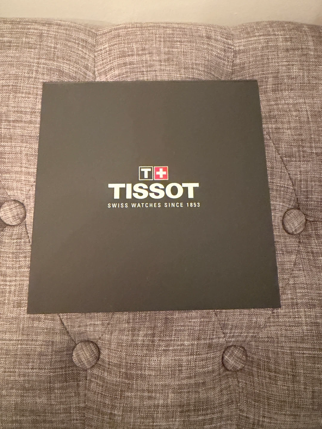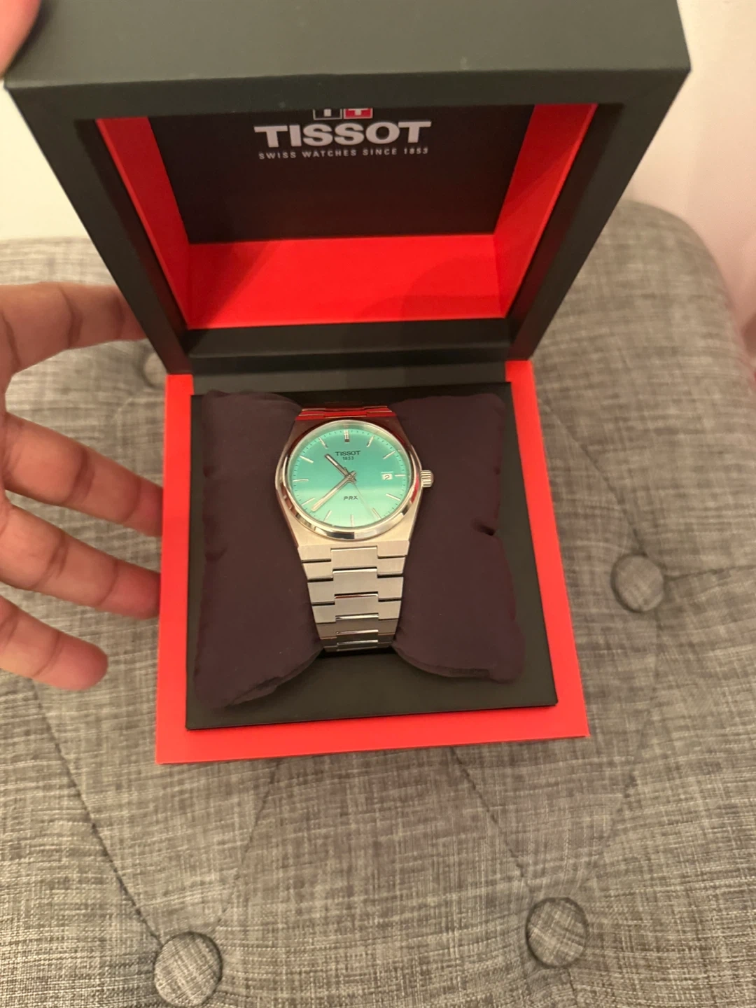 A Tissot PRX watch with a mint green dial. Includes original box and packaging. Quartz movement with date function. Barely used. Available with Box, tags, extra link, cards etc. Prostine condition