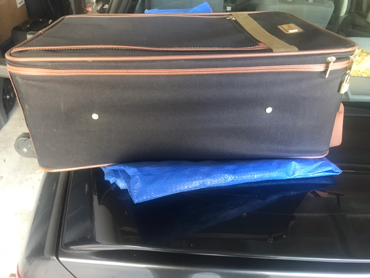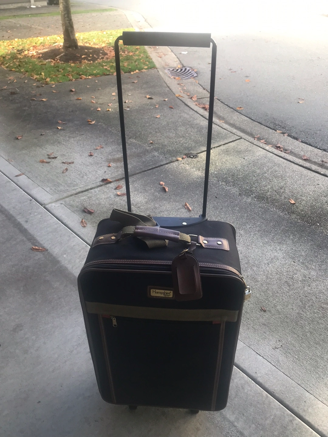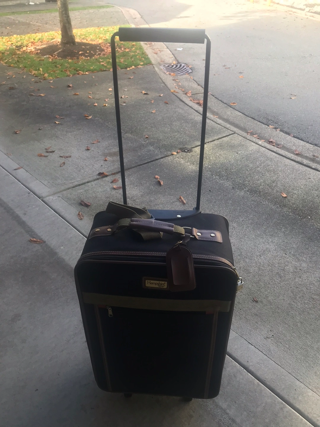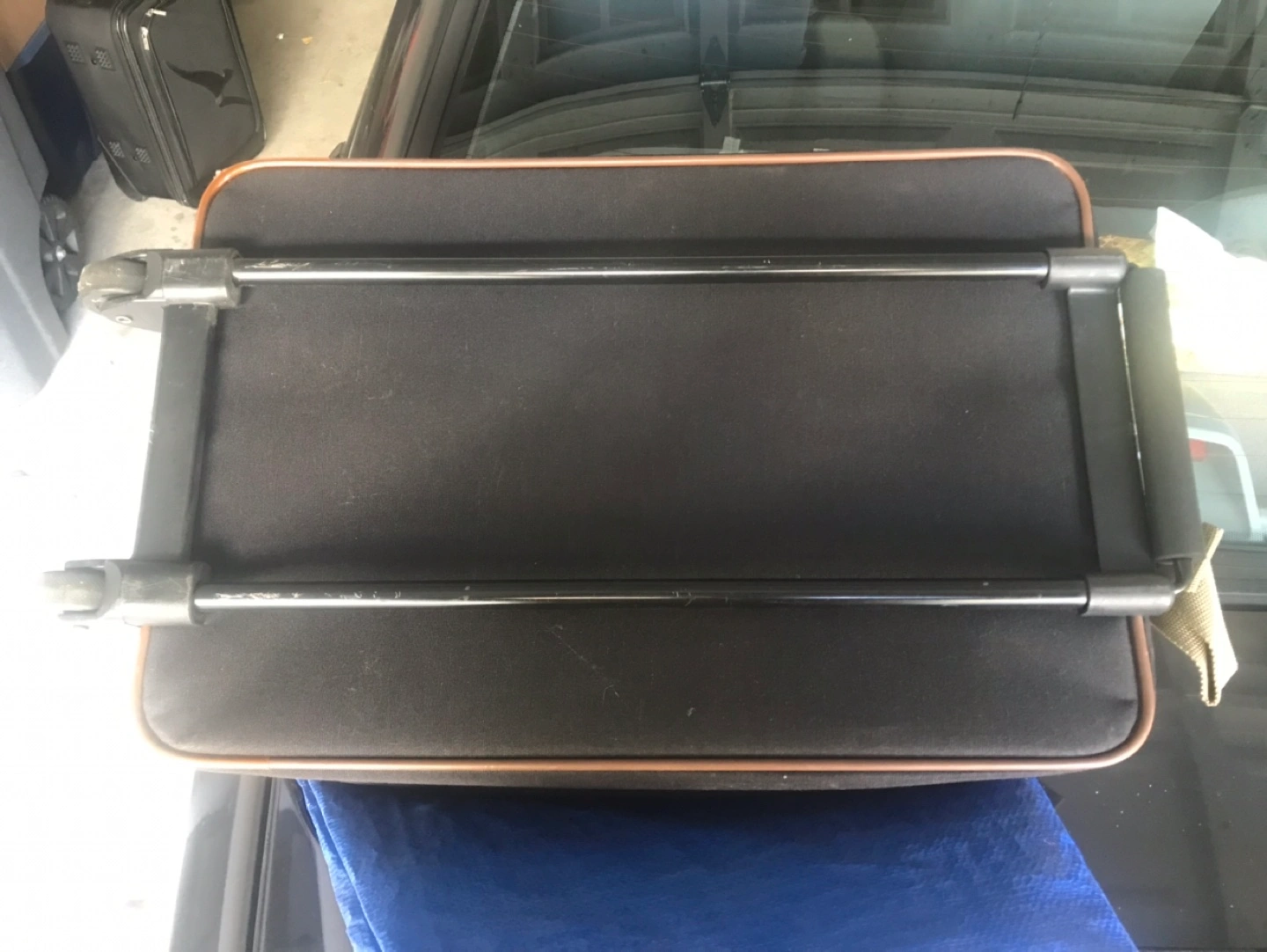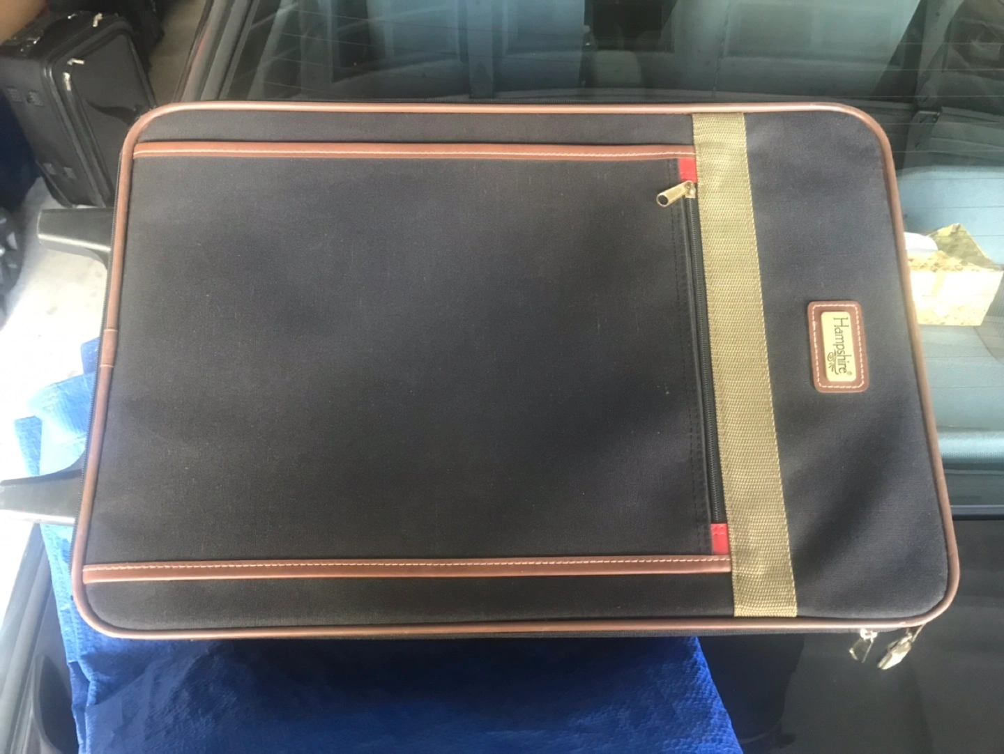 Black carry-on suitcase with brown accents. Features an extendable handle and 2 wheels. Has a zip pocket on the inside and a small tag holder.