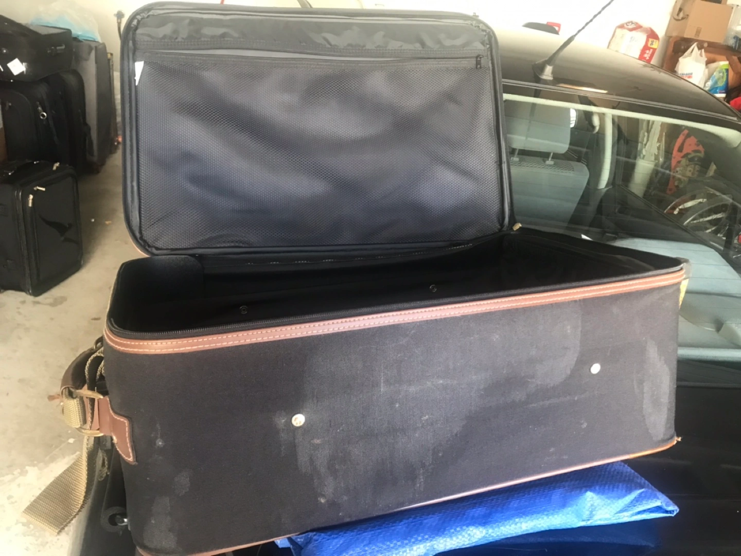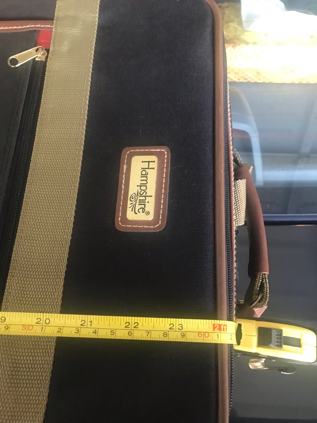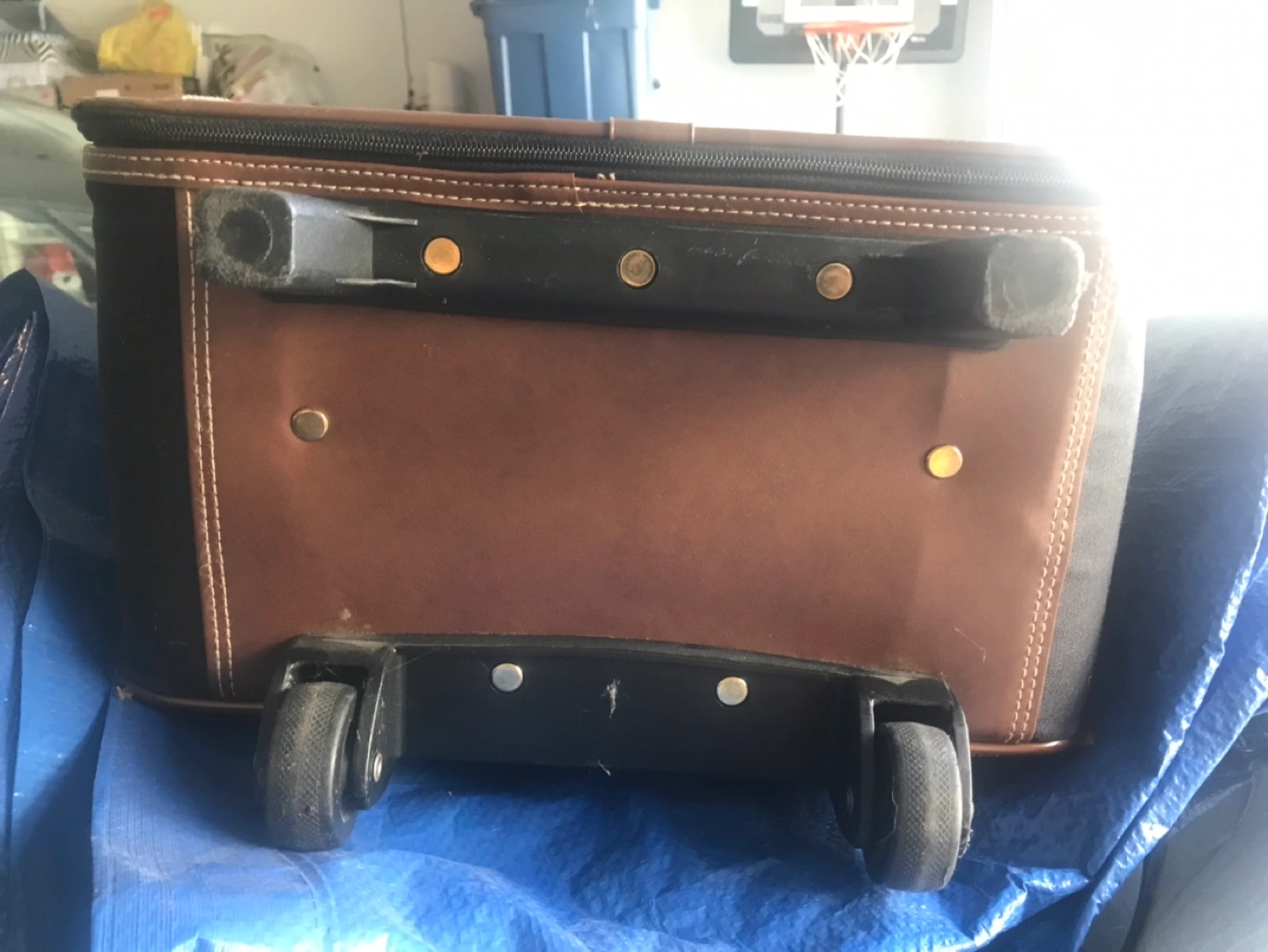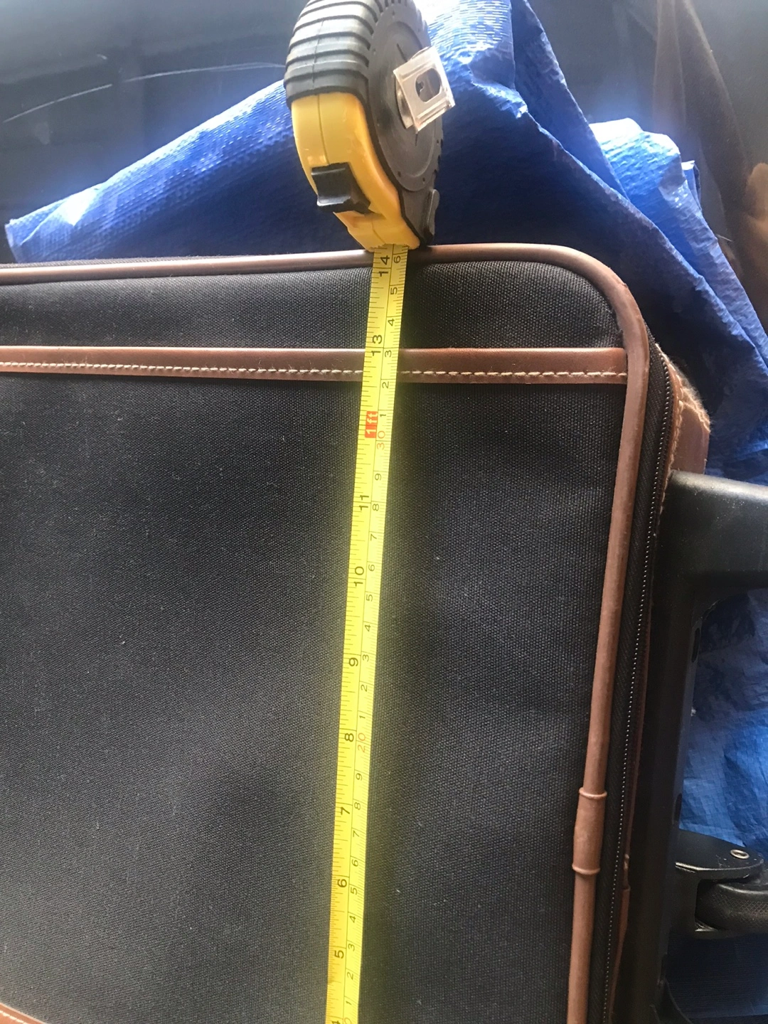 Black carry-on suitcase with brown accents. Features an extendable handle and 2 wheels. Has a zip pocket on the inside and a small tag holder.