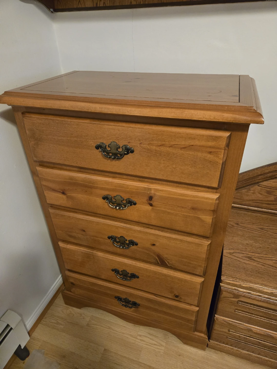 This is a sturdy wooden dresser with five drawers. It's made of solid wood with decorative brass-style handles. Plenty of storage space for clothes or linens!
