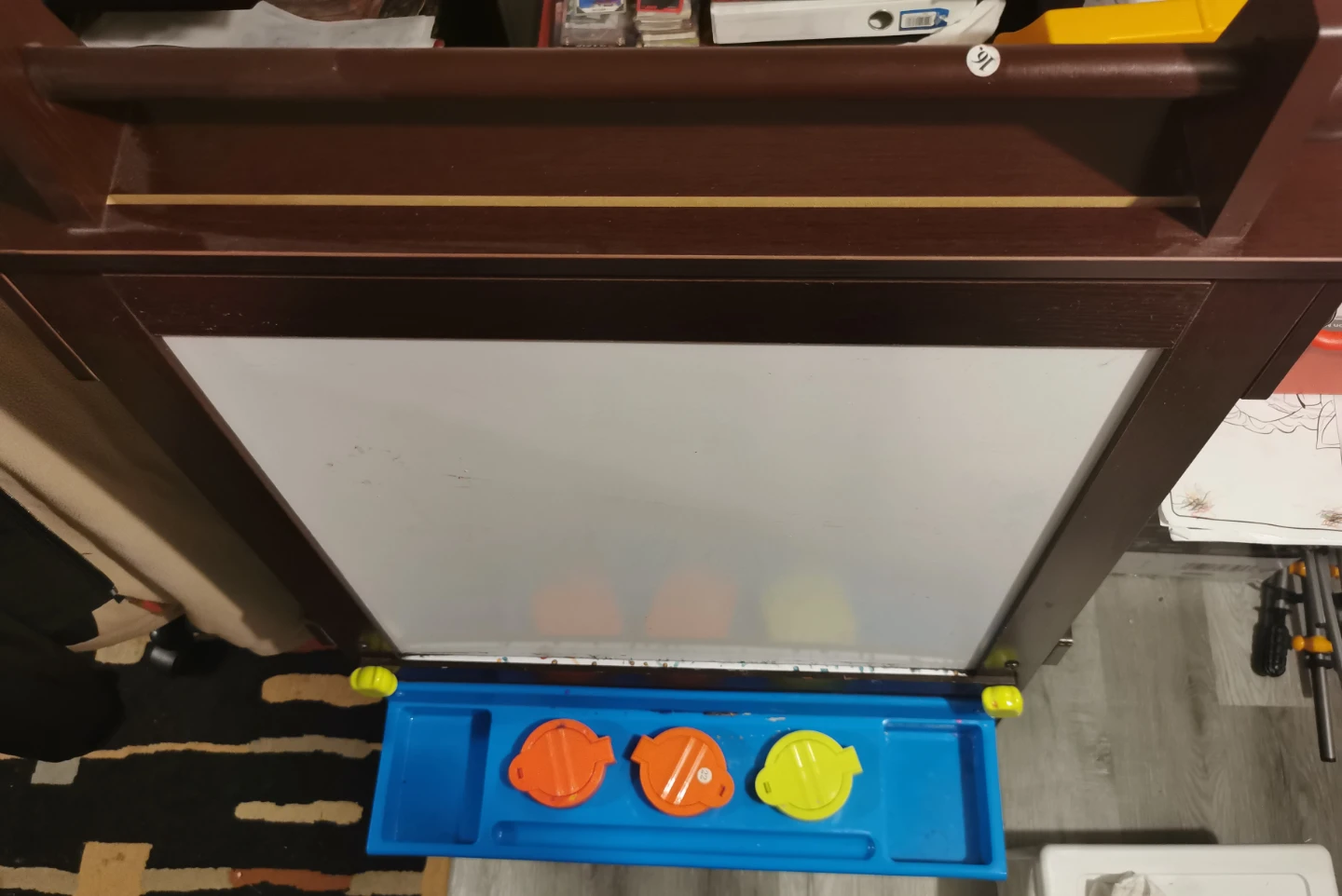 This double-sided easel has a whiteboard and a chalkboard surface. It comes with a blue art tray and three colorful paint pots. It's a great way for kids to get creative!
