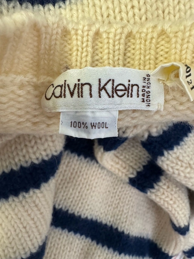 Excellent condition, size medium women’s, made with wool Elegant wool sweater with bold black stripes. Ideal for stylish comfort. This Calvin Klein wool sweater, size medium, is in excellent, like-new condition, featuring a classic cream and navy striped design. Perfect for staying warm and stylish this season, it's made from 100% wool for ultimate comfort and durability.