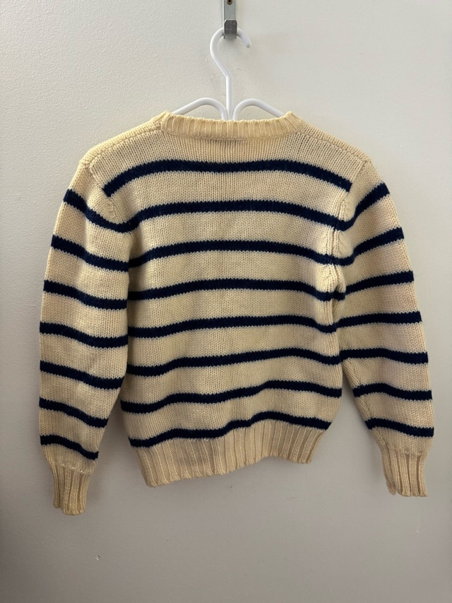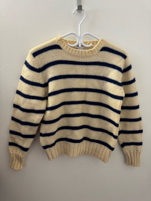 Excellent condition, size medium women’s, made with wool Elegant wool sweater with bold black stripes. Ideal for stylish comfort. This Calvin Klein wool sweater, size medium, is in excellent, like-new condition, featuring a classic cream and navy striped design. Perfect for staying warm and stylish this season, it's made from 100% wool for ultimate comfort and durability.