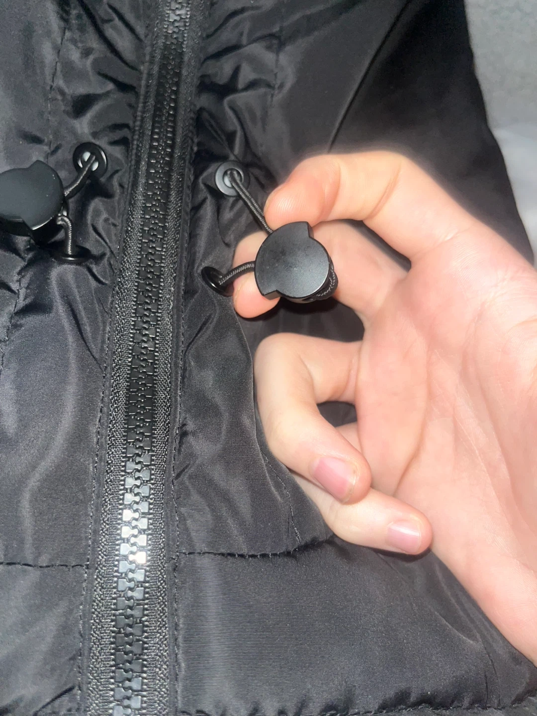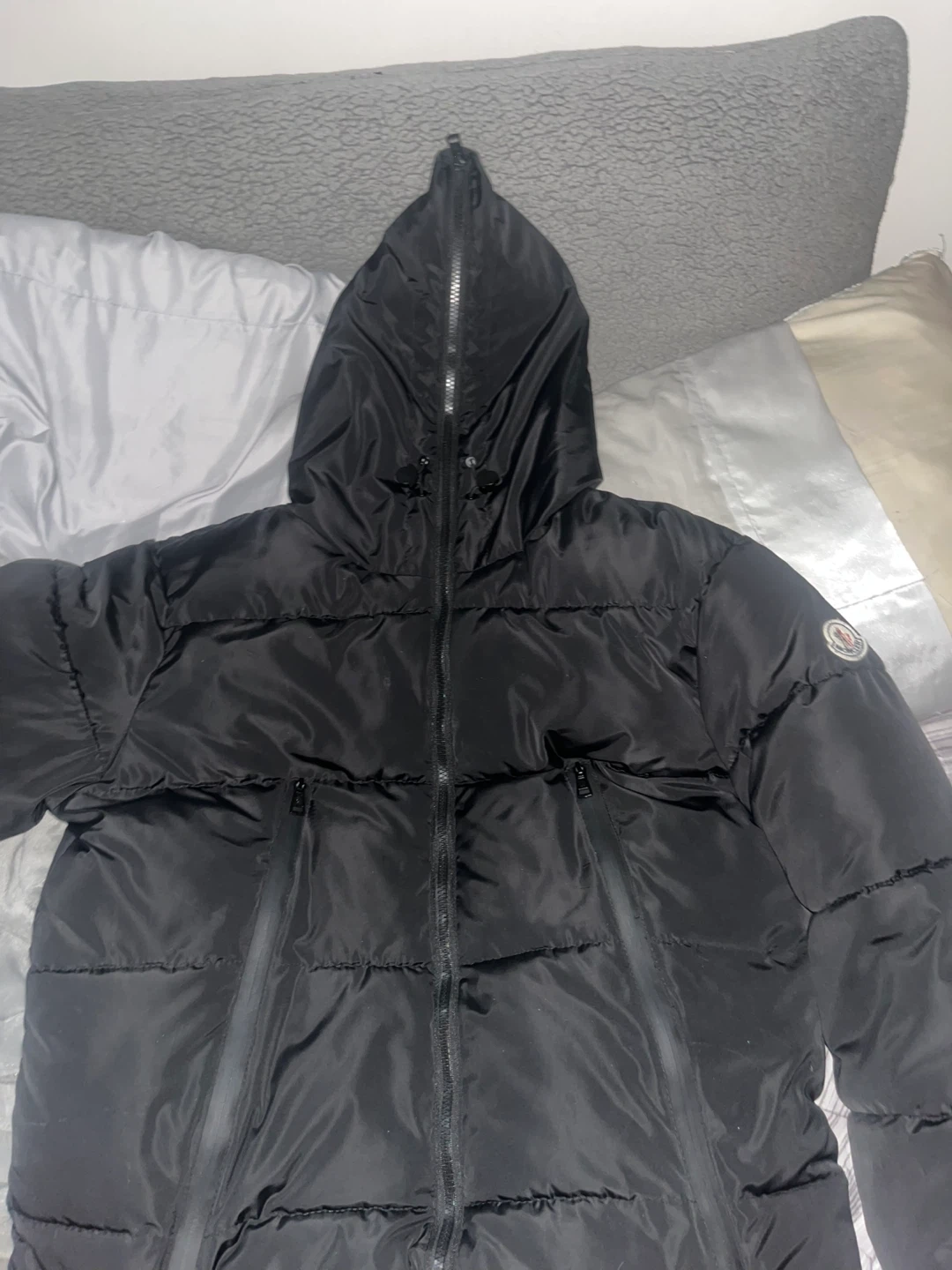 This is a Moncler black down puffer jacket. It's a warm and stylish outerwear piece perfect for colder weather. The jacket features a hood and full zip closure.
