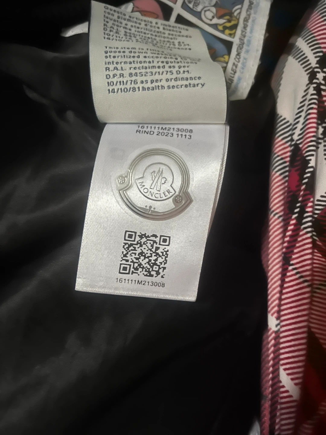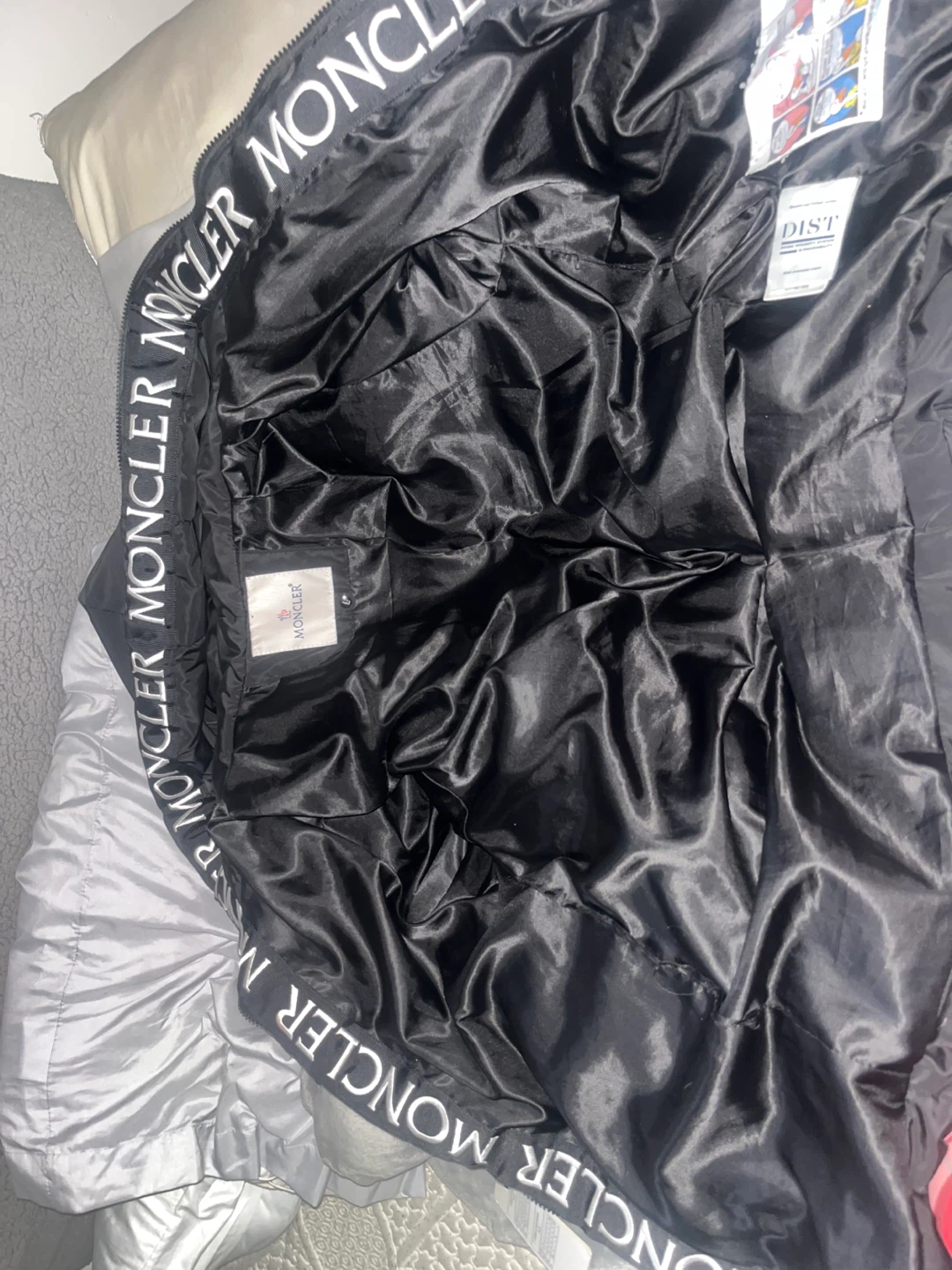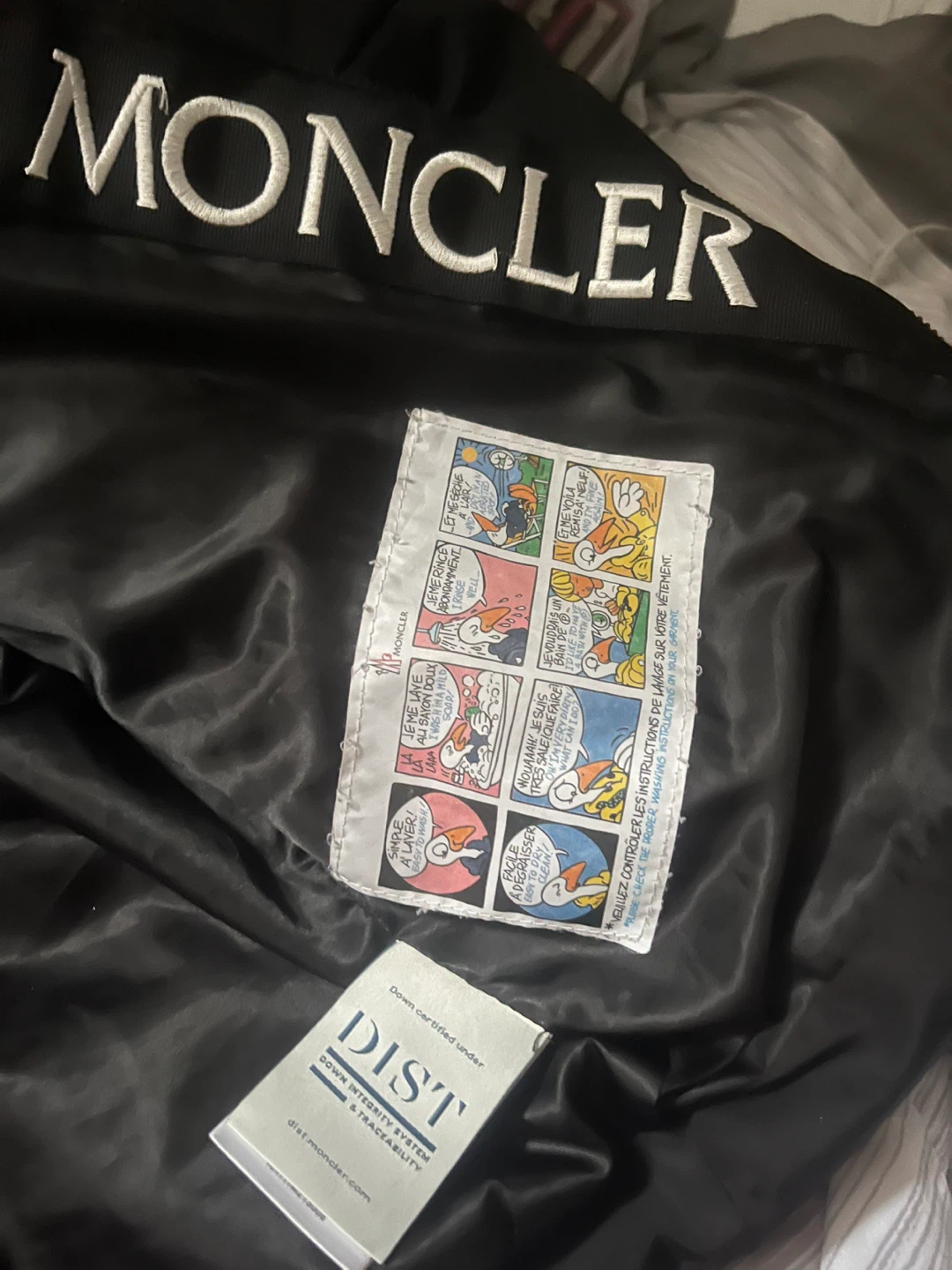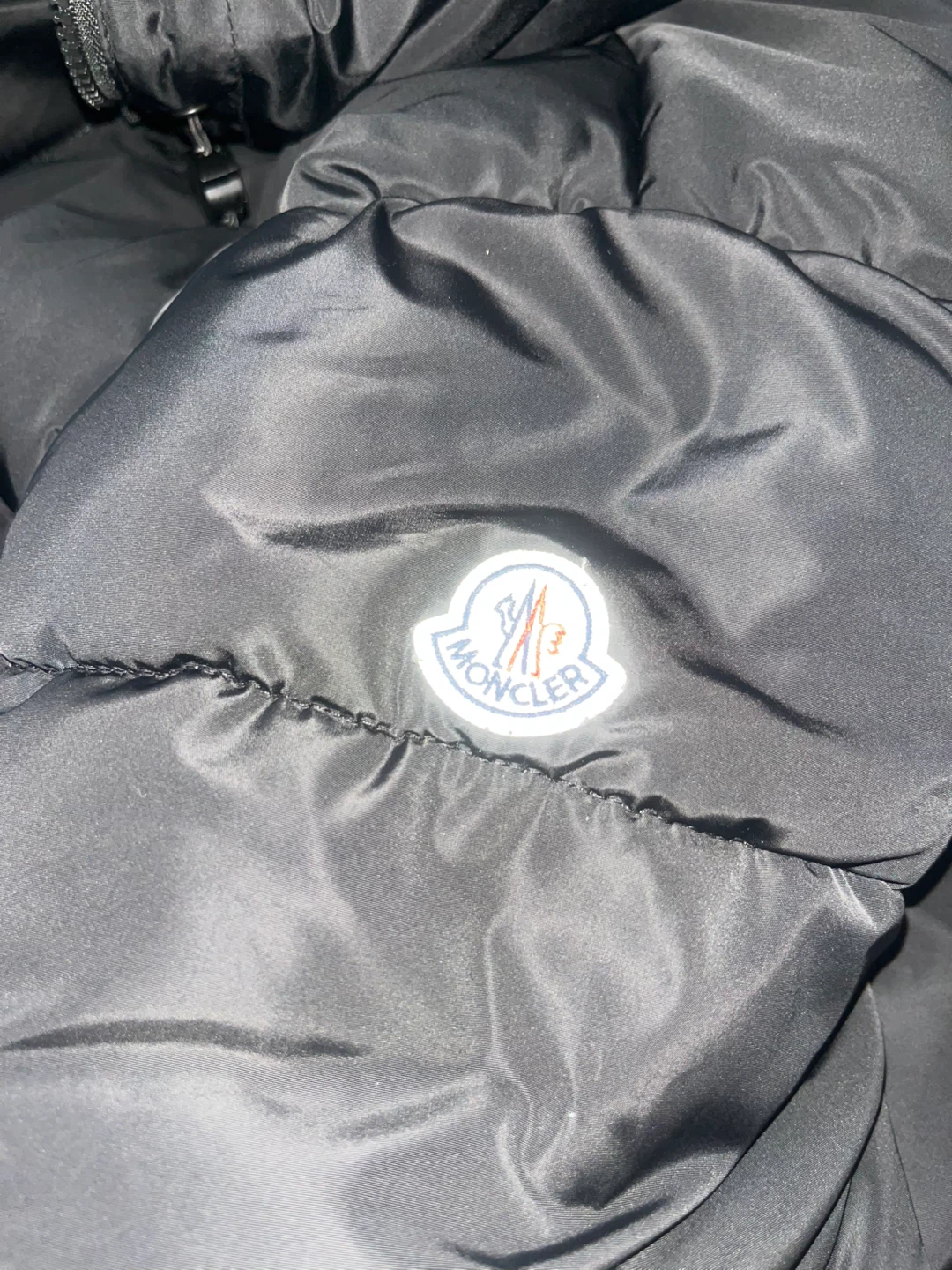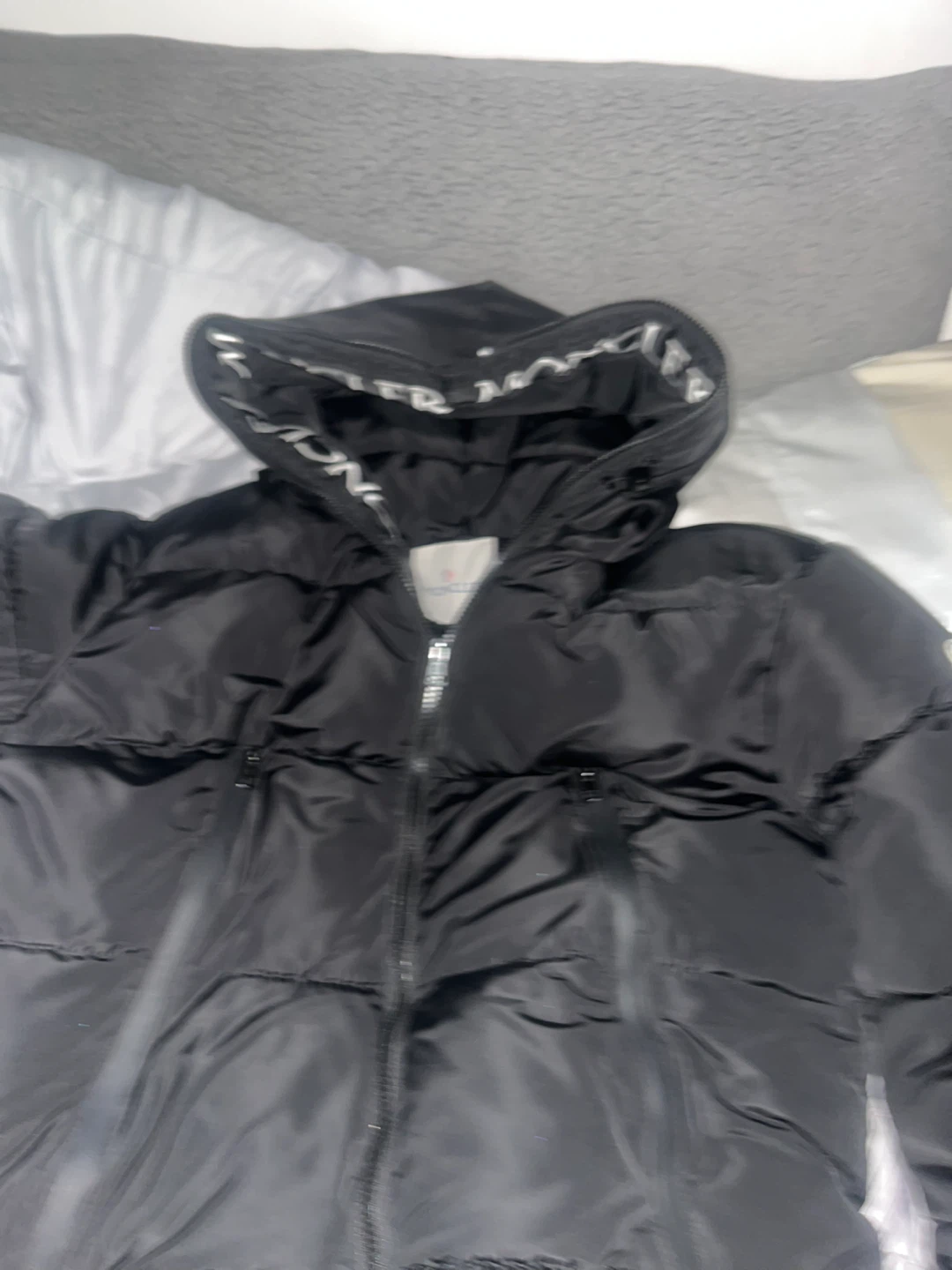 This is a Moncler black down puffer jacket. It's a warm and stylish outerwear piece perfect for colder weather. The jacket features a hood and full zip closure.