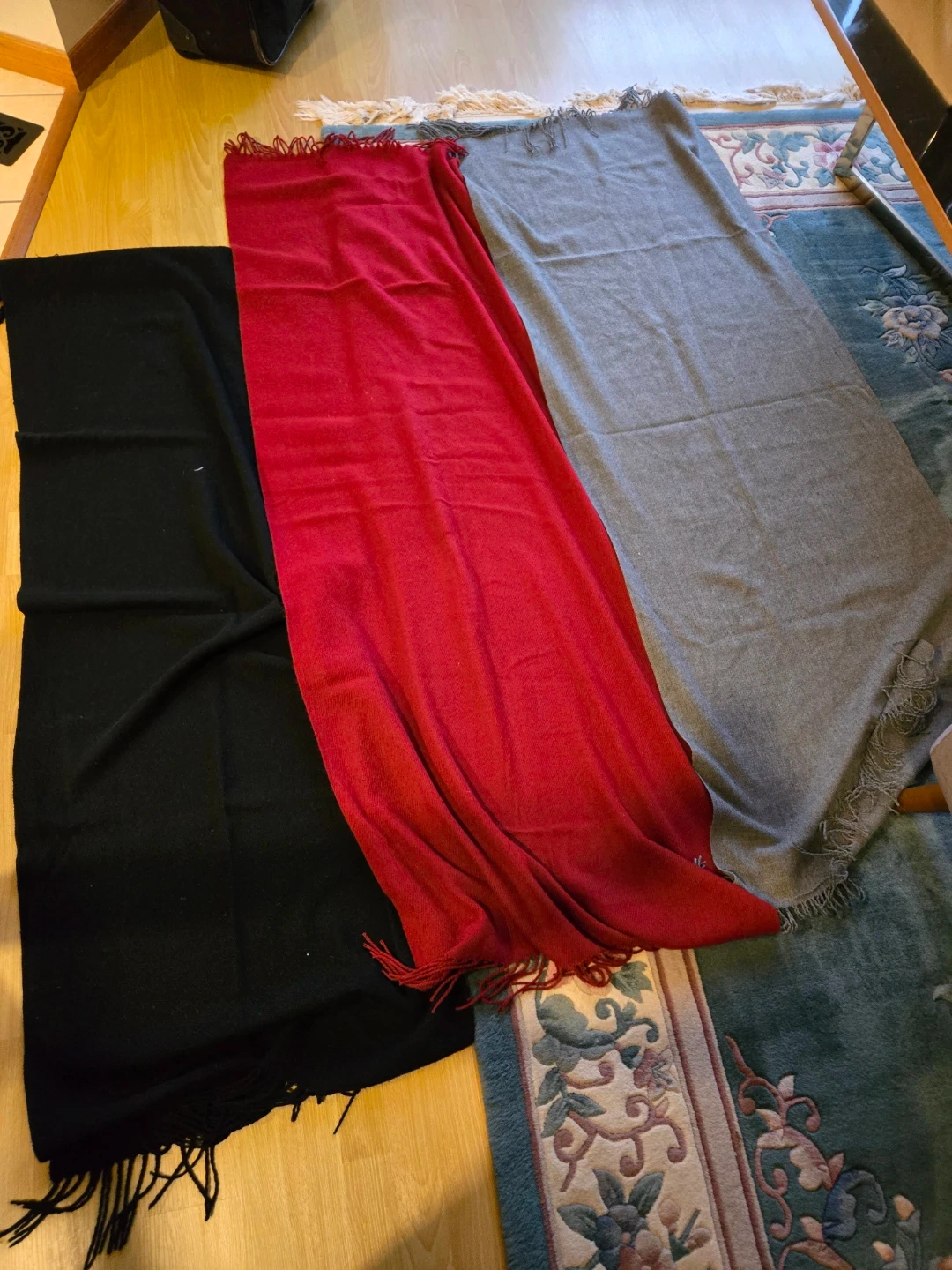 A set of three scarves in black, red, and grey. Scarves have a fringe detail. They're soft and look to be a wool or acrylic blend. Approximately 6 ft long