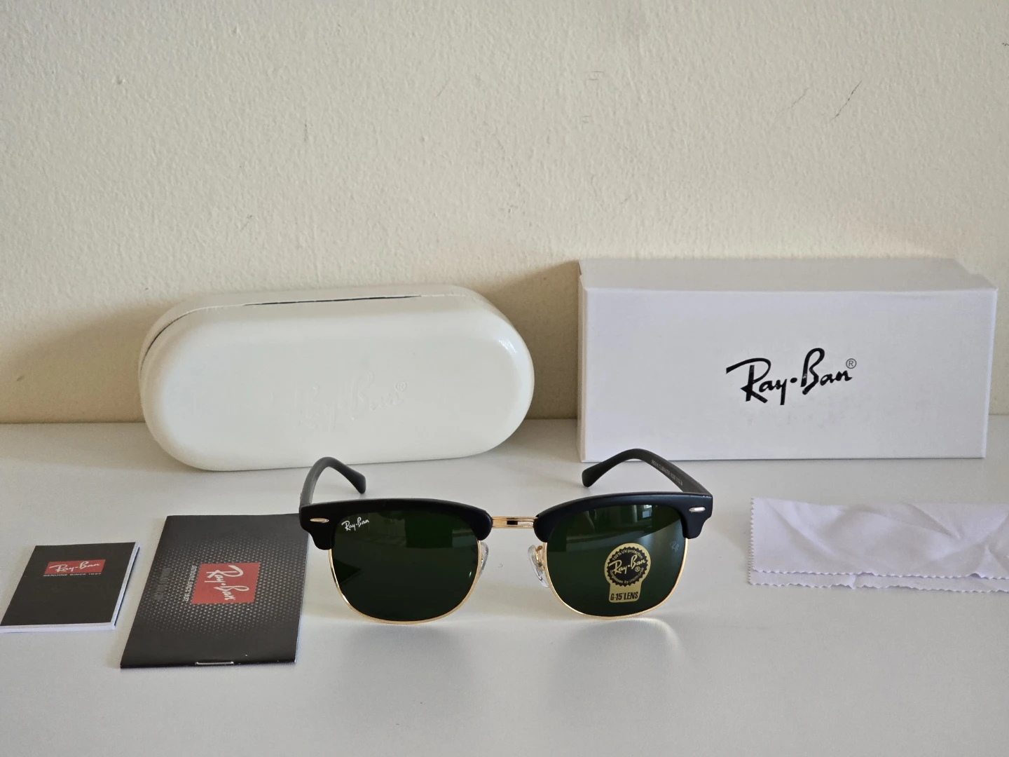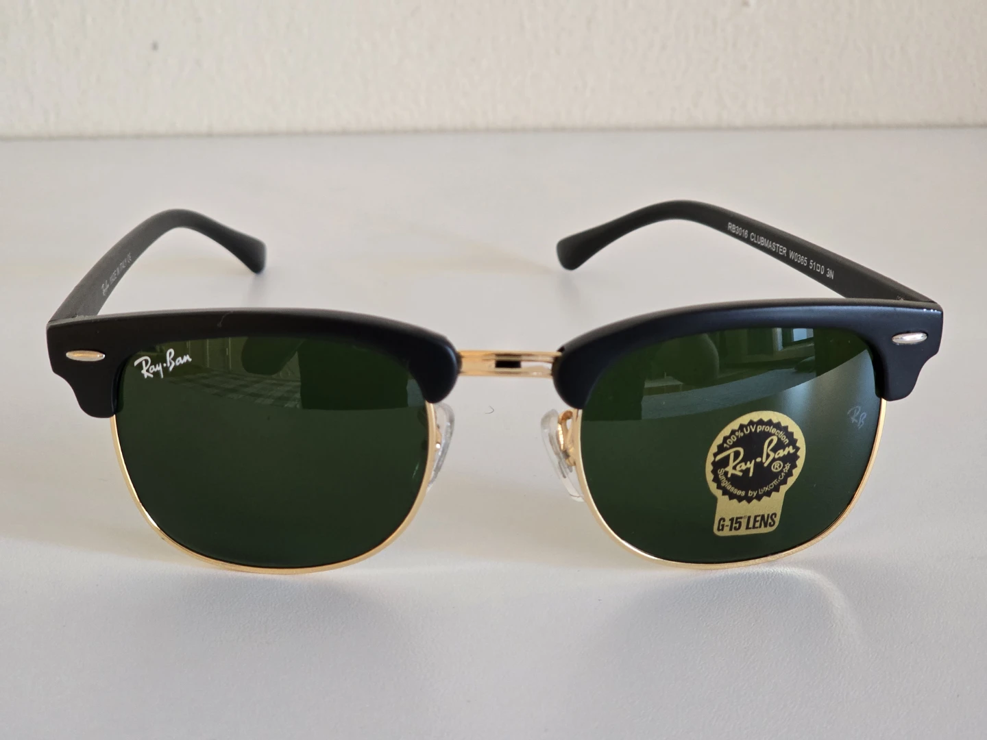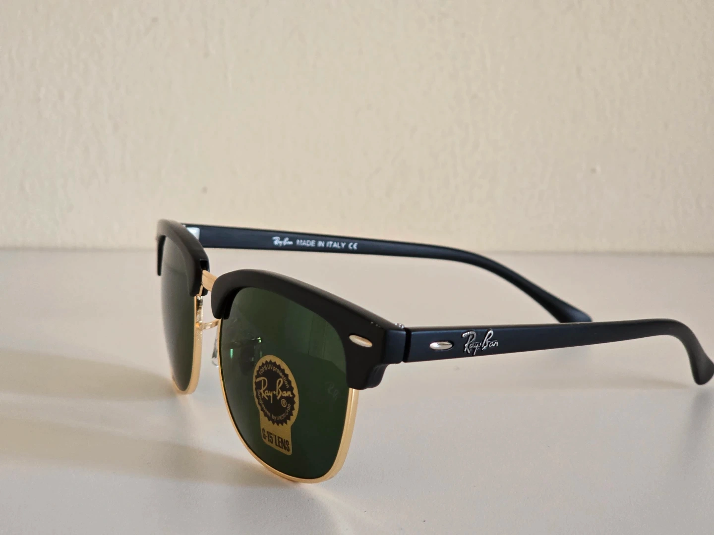 Classic Ray-Ban Clubmaster sunglasses with black frames and green G-15 lenses. These shades are made in Italy and offer 100% UV protection. They come with the original case, box, and cleaning cloth.