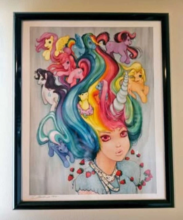 Custom framed print by Camilla D'Errico. Based on the love for eighties My Little Pony. Beautiful art. Numbered #7/100 and signed by Camilla. In EUC and was custom framed. Measures approximately 21 inches x 17.5 inches. Purchased direct from the artist's website. Changing some of the art in my place and hoping this beautiful one will find a new owner that will appreciate it. From a smoke free, pet friendly home in Woodstock. Cross posted. - $140 (firm) Pick up only.