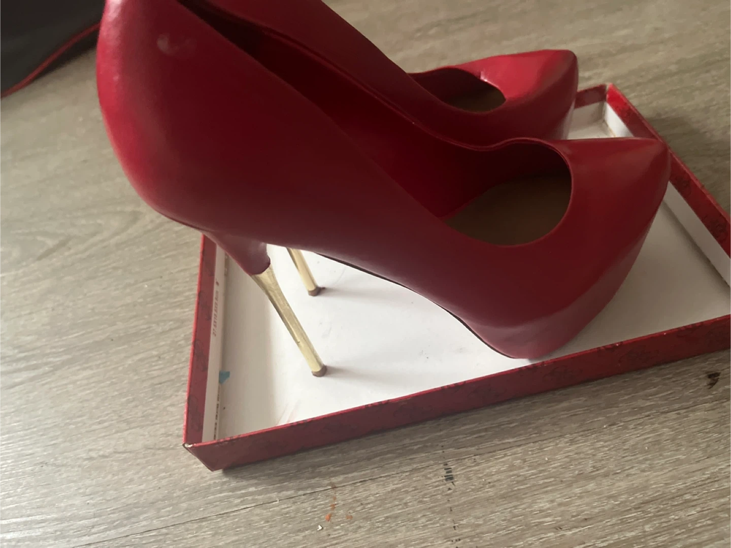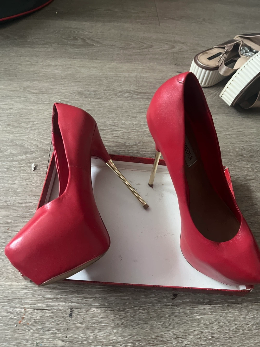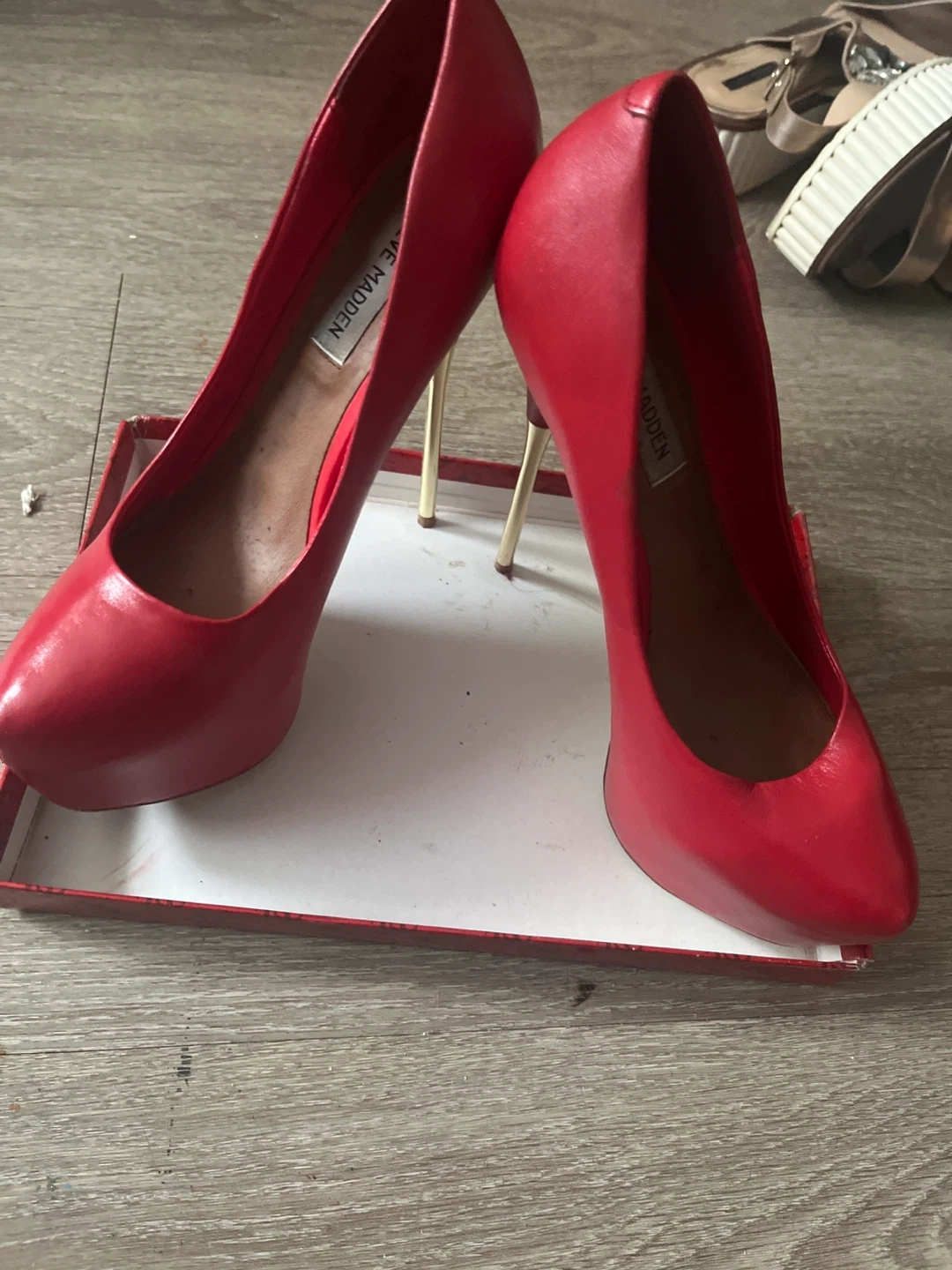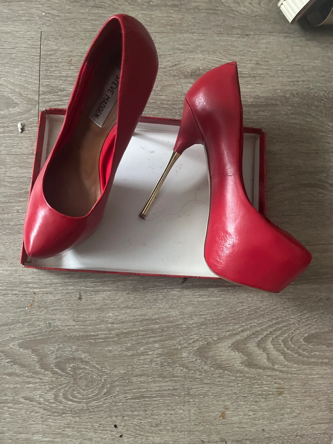 These striking red heels are from Steve Madden. They feature a bold gold stiletto heel. Perfect for adding a pop of color to any outfit!
