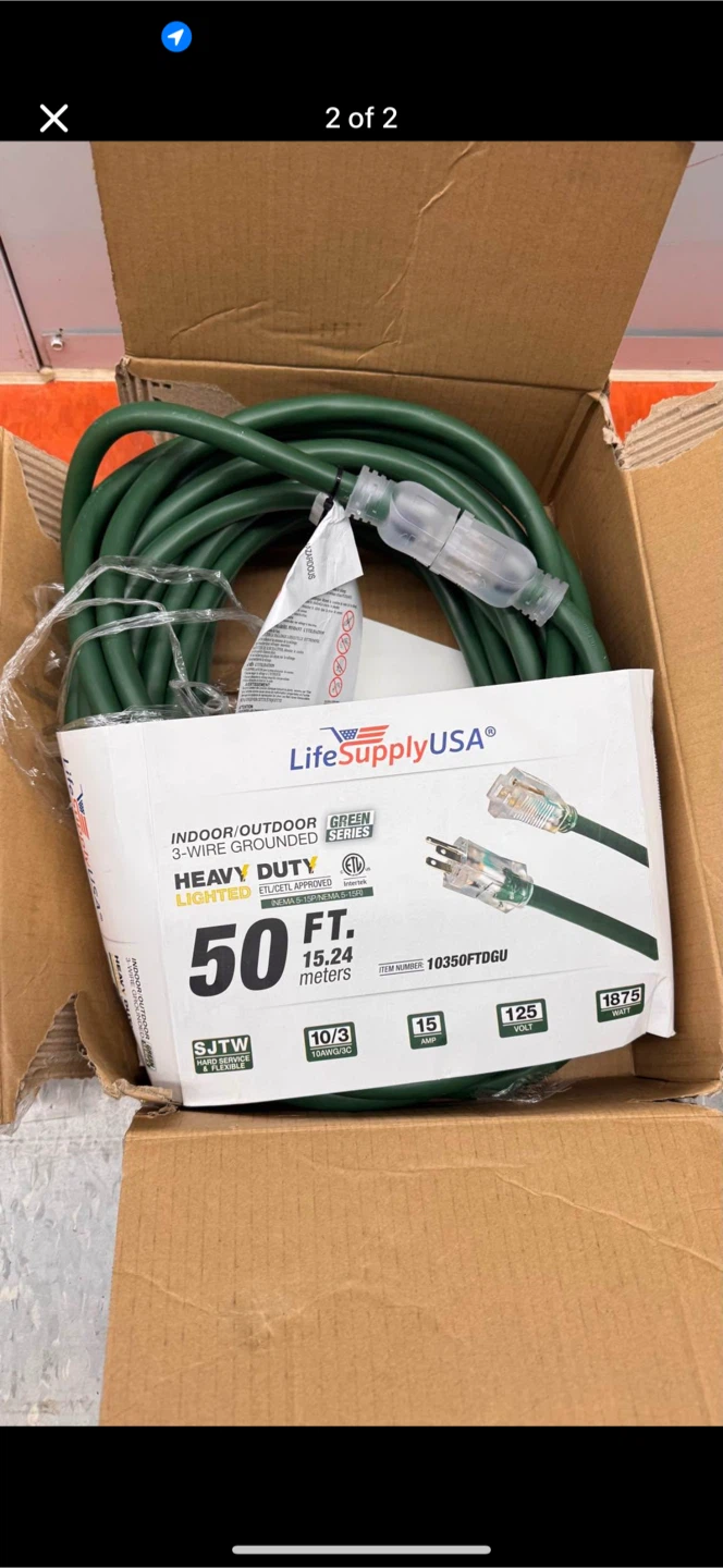 Selling a LifeSupplyUSA heavy-duty extension cord! It's 50 feet long (15.24 meters), perfect for indoor or outdoor use. It's a 3-wire grounded cord from the Green Series and is rated for 15 amps, 125 volts, and 1875 watts. The cord is SJTW and super flexible for easy handling. Comes in its original box!