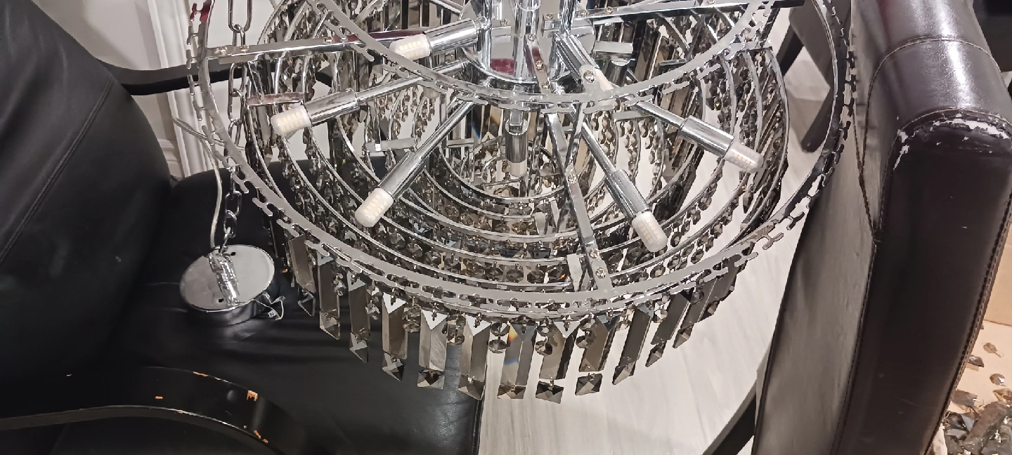 "Luxury Chandelier! Stunning modern circular design with a cascade of faceted crystals. Transform your home into a magazine-worthy space. Price: $200. Pickup is at the buyer's expense."
