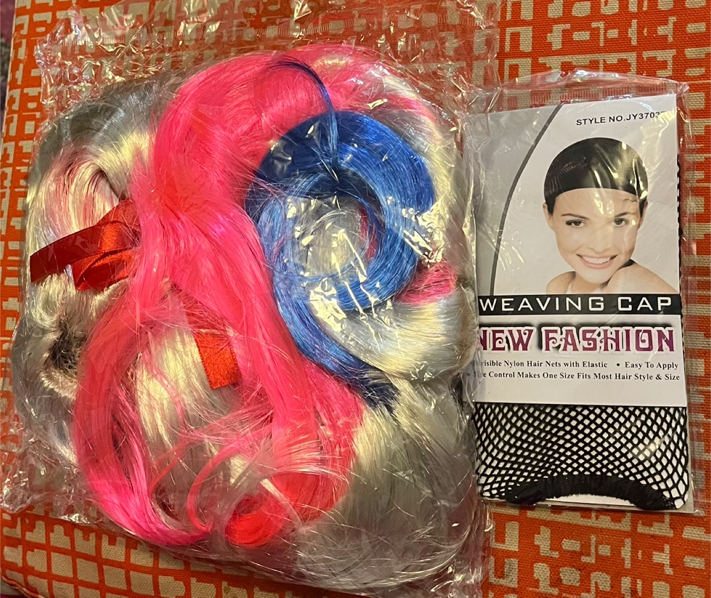 Two long wigs in pink, blue, and silver. They're suitable for parties and carnivals. Includes a weaving cap with elastic for a secure fit. One size fits most hair styles.