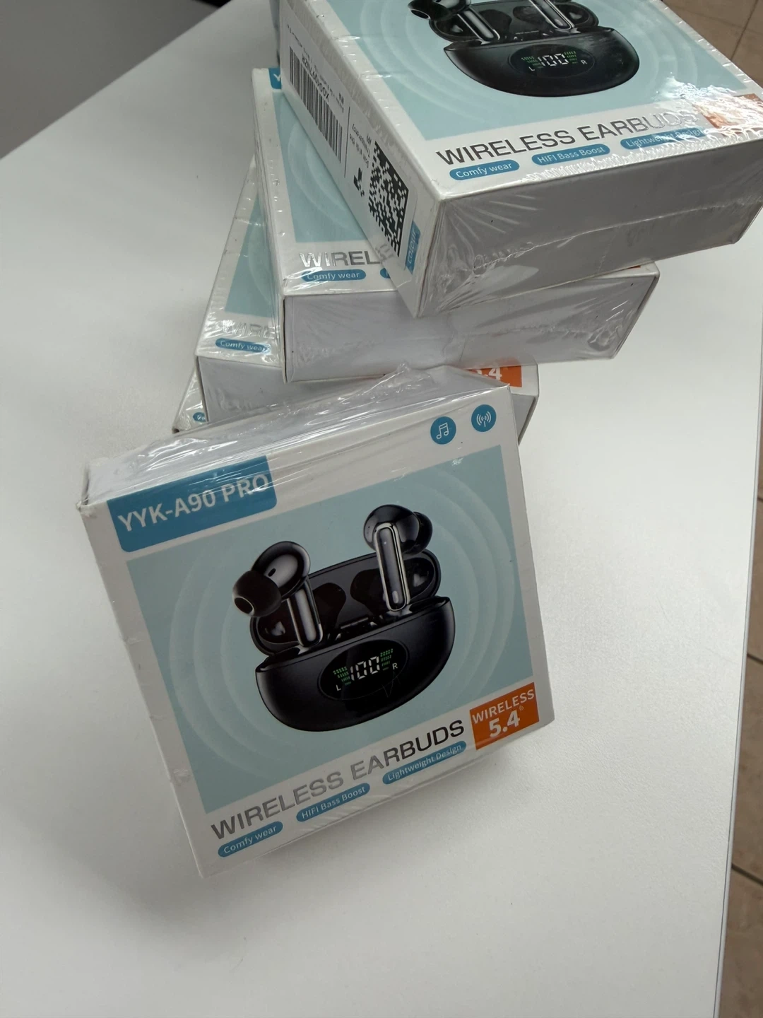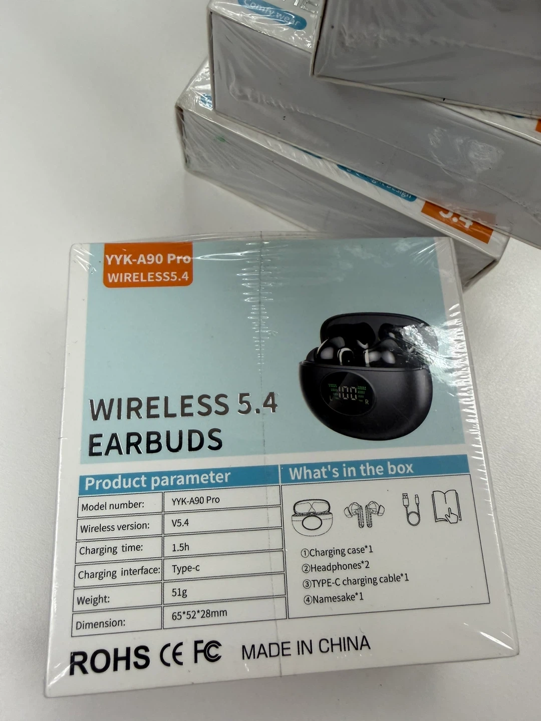 Introducing the YYK-A90 Pro wireless earbuds with Bluetooth 5.4. These earbuds offer a 1.5h charging time and a 51g weight. They come with a charging case, two headphones, a Type-C charging cable, and a namesake.Sealed box.