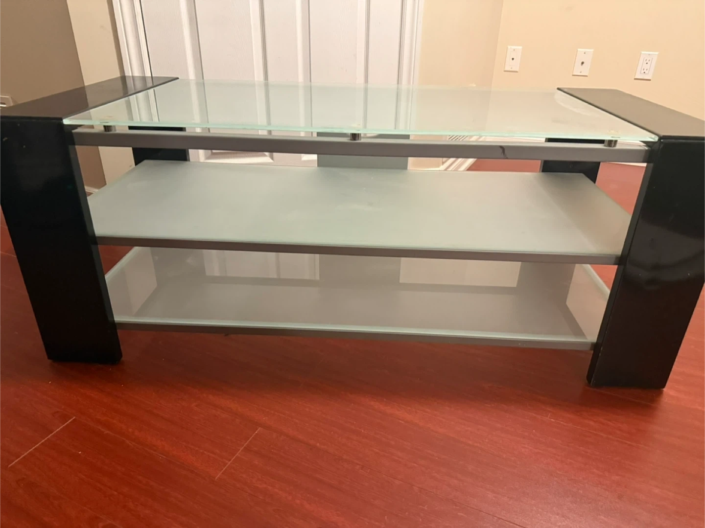 A stylish TV stand featuring a tempered glass top and two lower shelves. It has black metal accents for a modern look. Perfect for organizing your media devices and accessories.