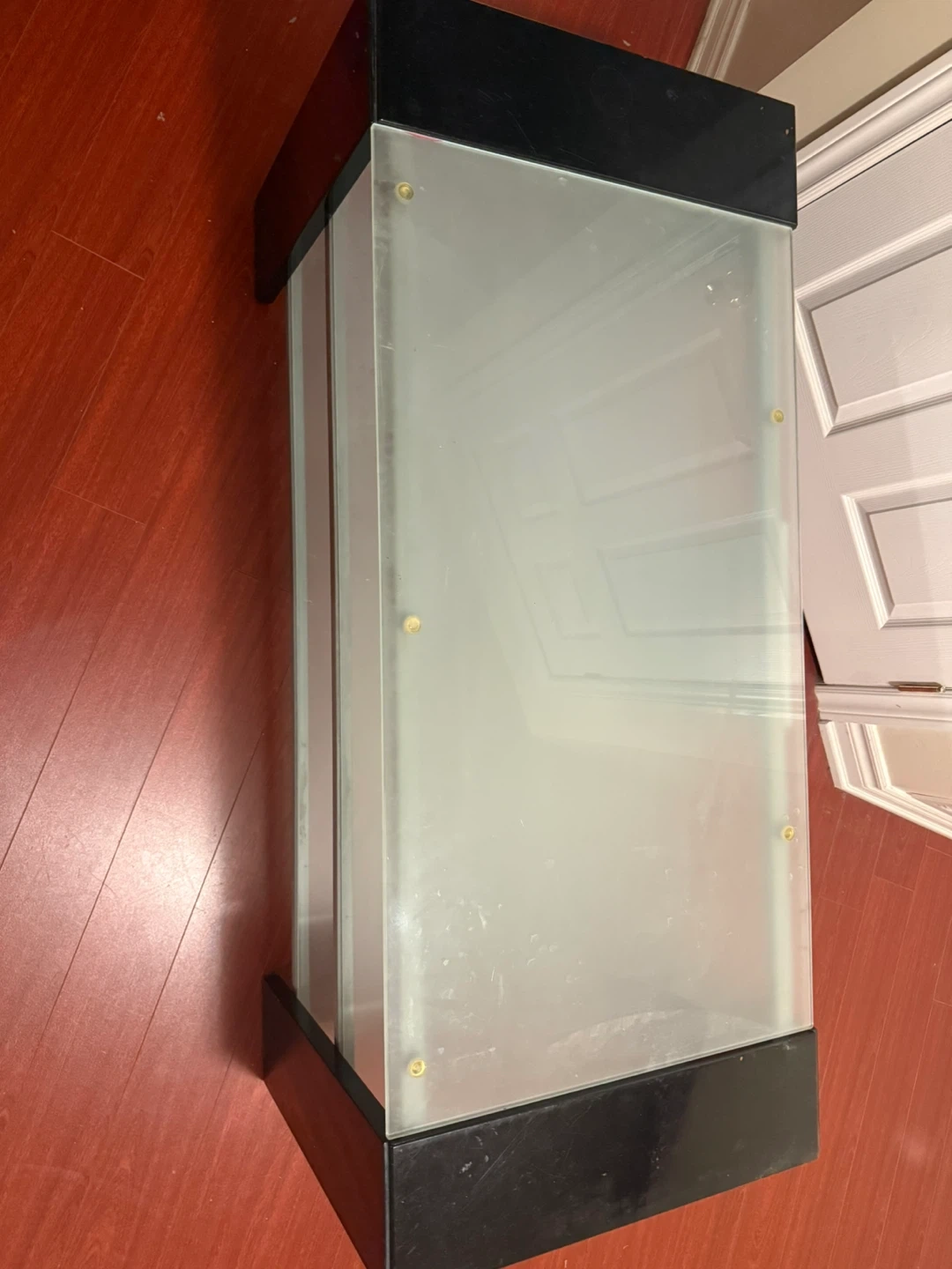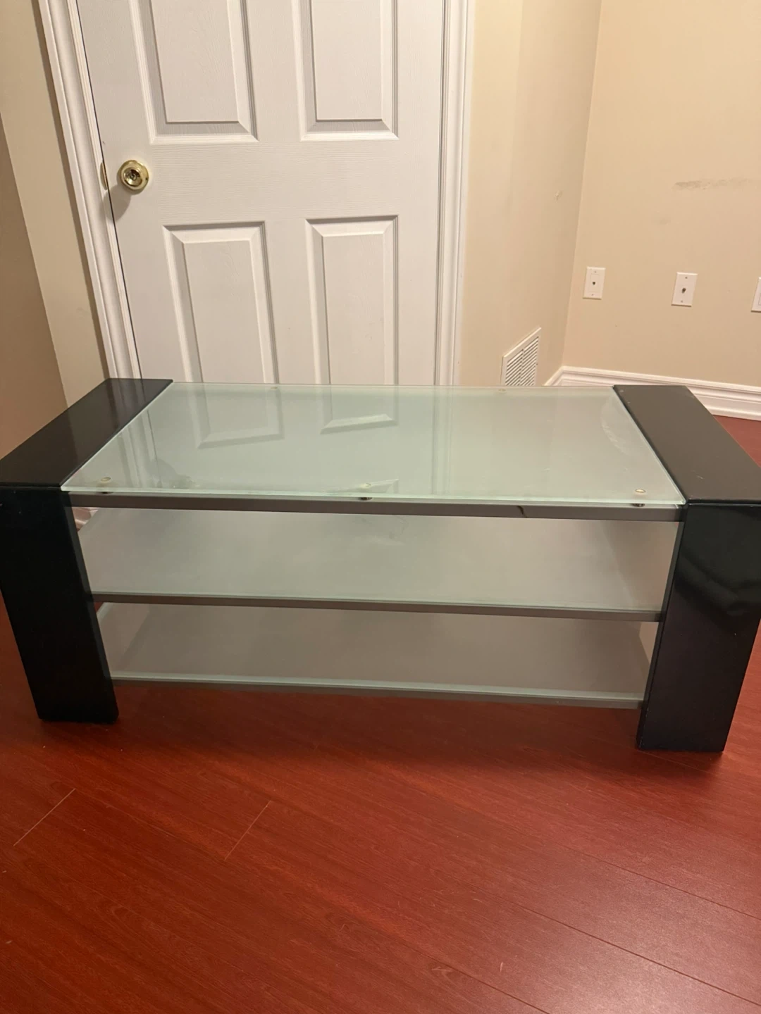 A stylish TV stand featuring a tempered glass top and two lower shelves. It has black metal accents for a modern look. Perfect for organizing your media devices and accessories.