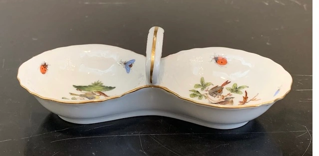 A beautiful porcelain dish perfect for serving condiments or snacks or salt and pepper. The dish features a hand-painted rare Rothschild design with two separate serving areas connected by a handle. A gold trim details the scalloped edges and the handle. This is a beautiful and unique piece of tableware that would make a wonderful addition to any collection. No damage scratches chips.