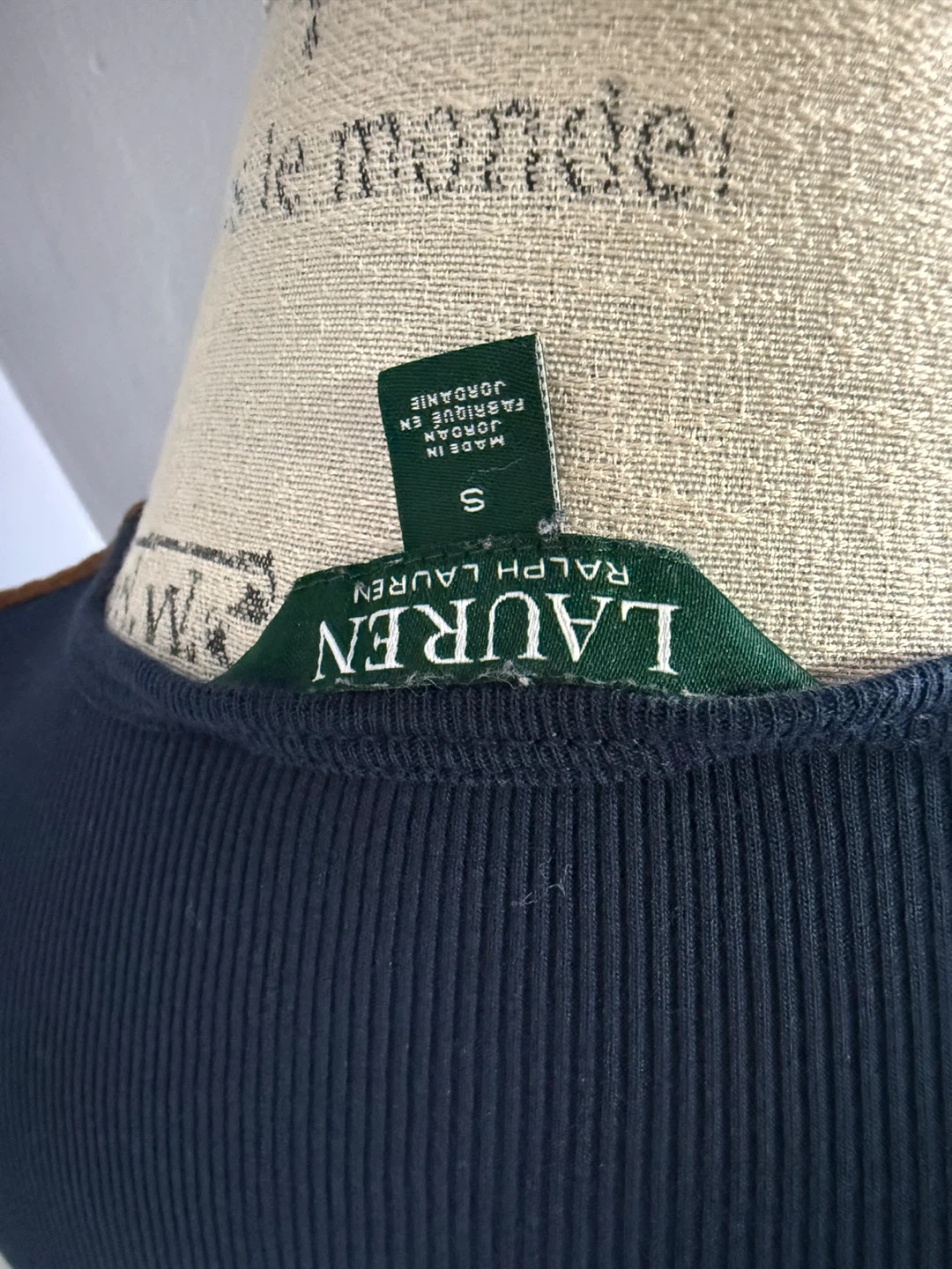 This is a navy blue, long-sleeved ribbed top from Ralph Lauren. It's a size small. The shoulders have decorative zipper details.