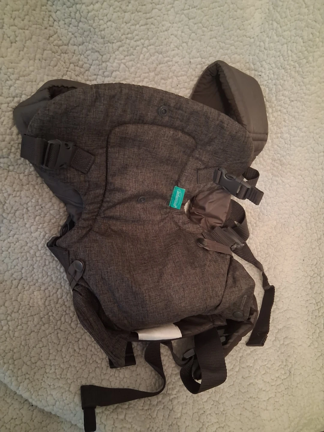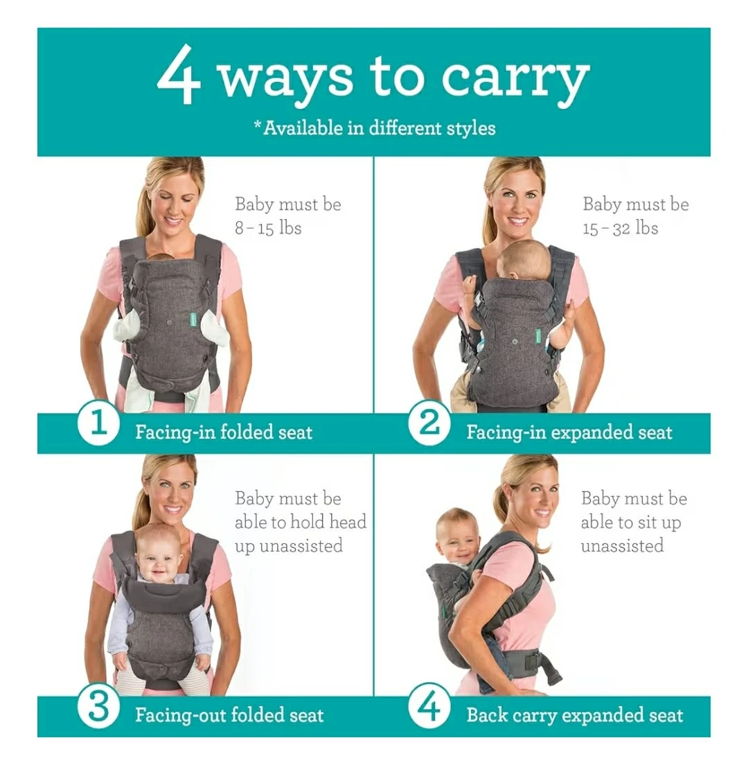 I'm selling an Infantino baby carrier in great condition! It's a comfortable and convenient way to carry your little one. The carrier is designed to support babies from 8-32lbs. It has multiple carrying positions to suit your needs as your baby grows. It's a versatile and practical choice for parents on the go!