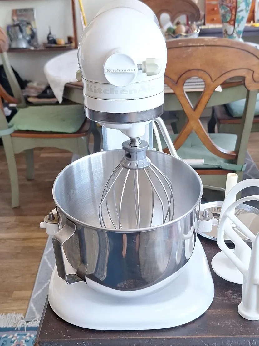 This is a white KitchenAid stand mixer. It includes a stainless steel bowl and whisk attachment. This mixer's a kitchen essential for baking and cooking!