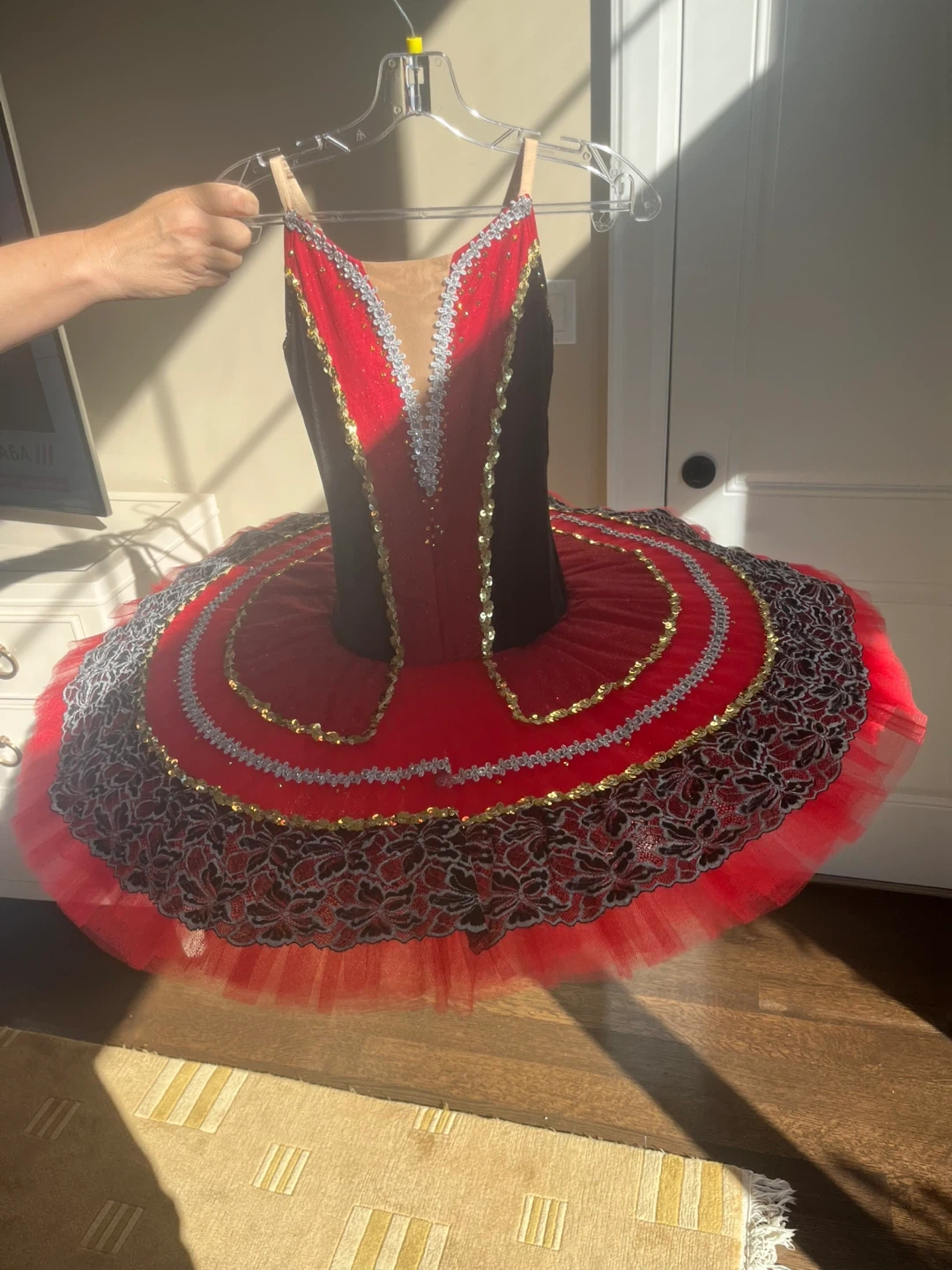 Selling a beautiful red ballet tutu. It features intricate detailing with black lace, gold accents, and silver trim. Perfect for performances or practice!