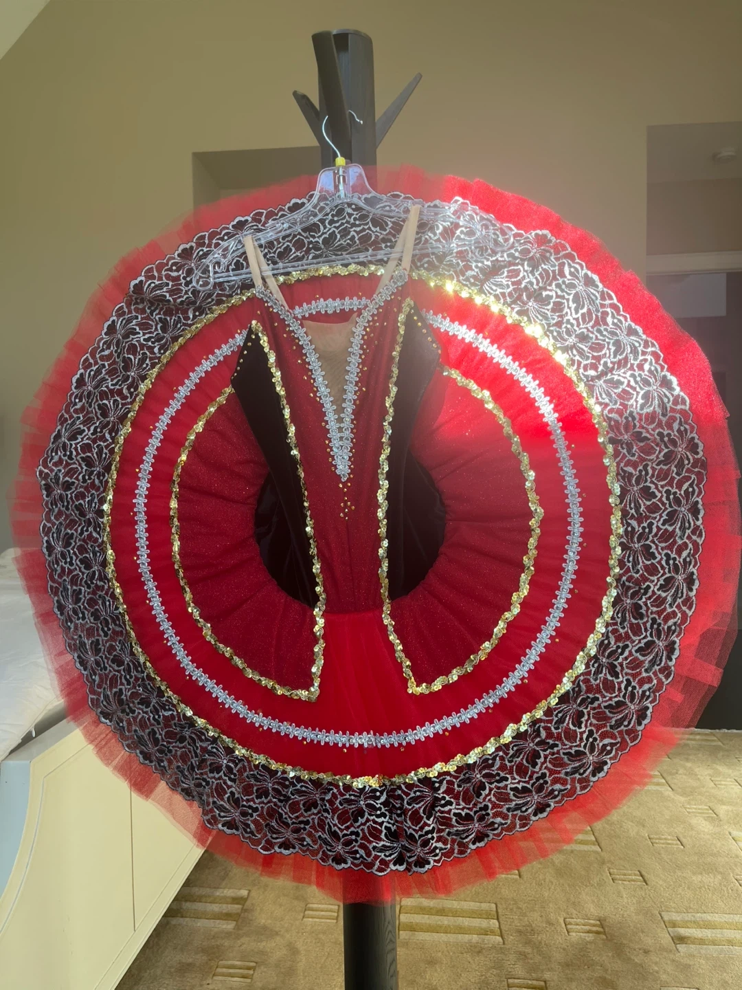 Selling a beautiful red ballet tutu. It features intricate detailing with black lace, gold accents, and silver trim. Perfect for performances or practice!