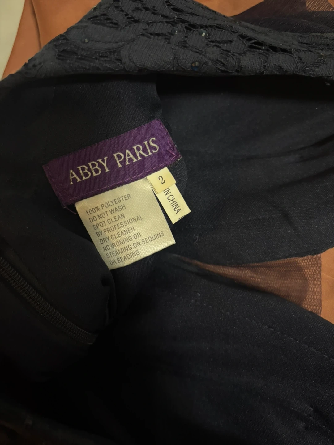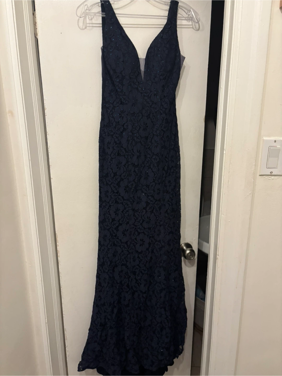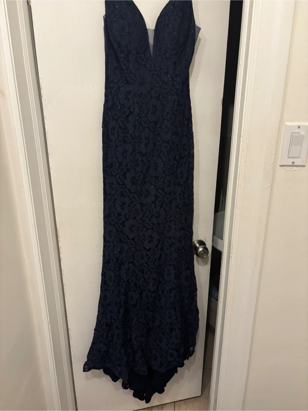 Navy lace evening gown by Abby Paris. Made of 100% polyester with sequin and beading embellishments. Size 2.