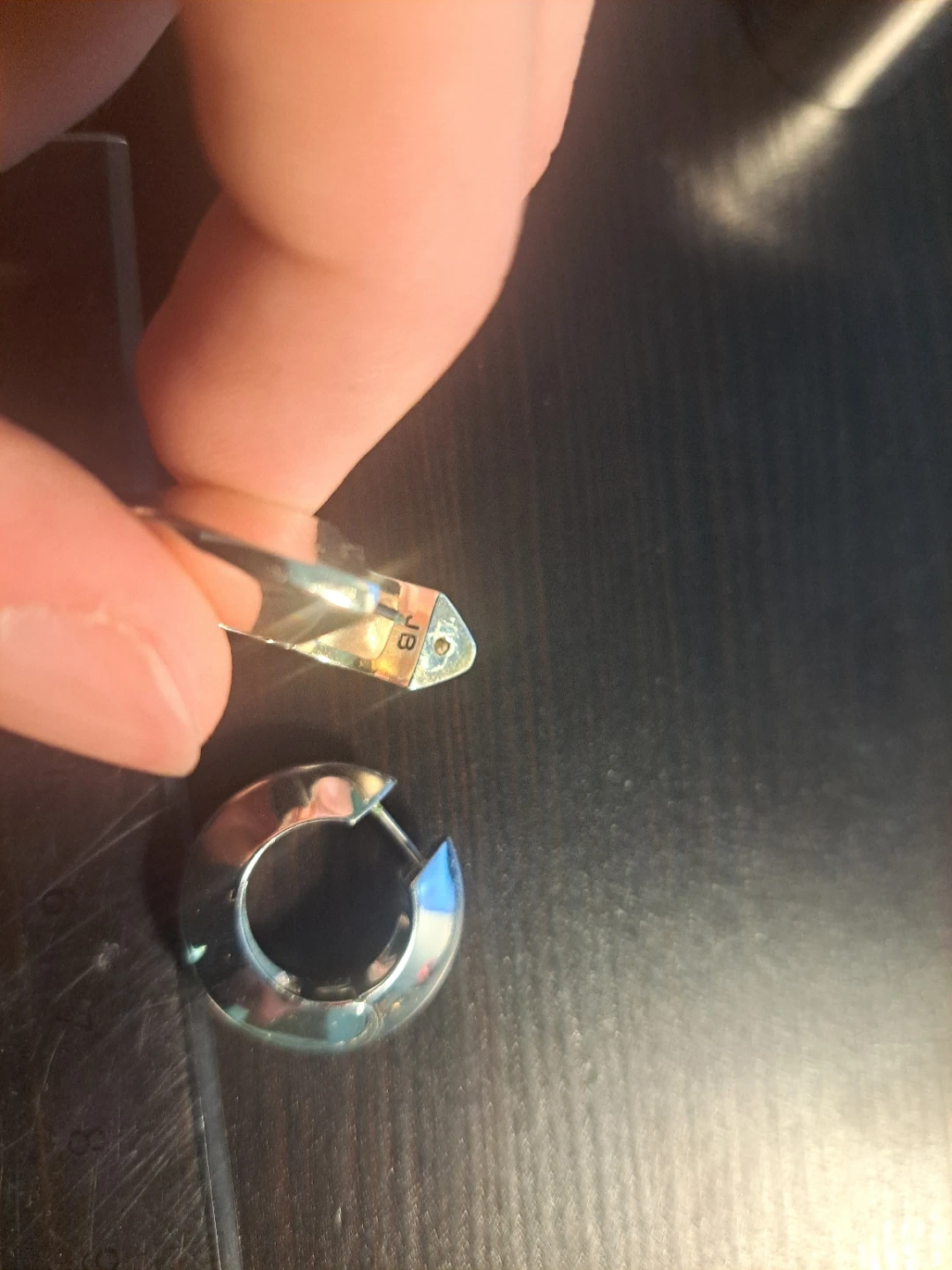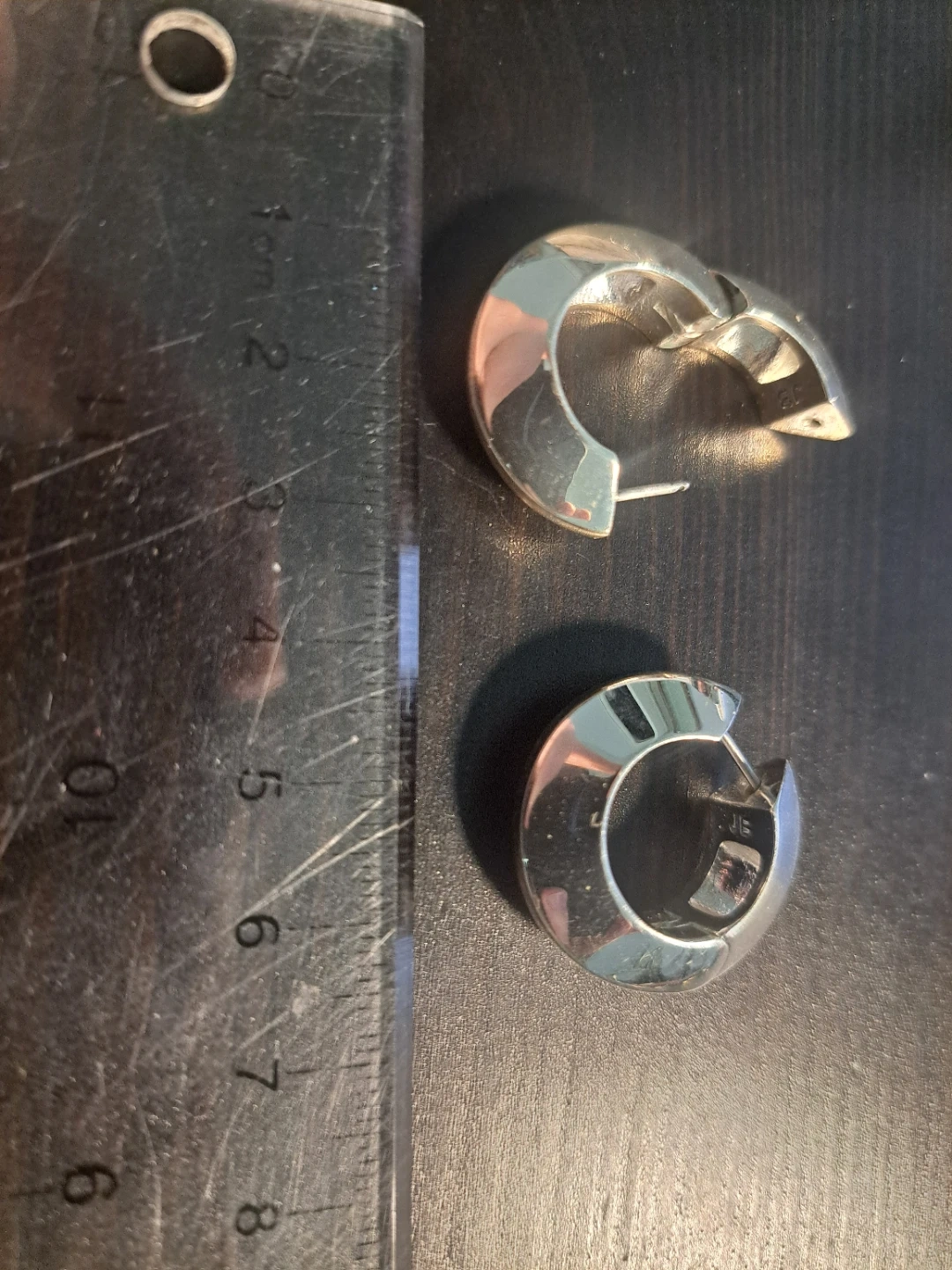 Stylish silver hoop earrings. These earrings have a sleek, modern design. The measurement from the ruler indicates they are approximately 3 cm in diameter. They're a versatile accessory for any outfit! From Jennybird.