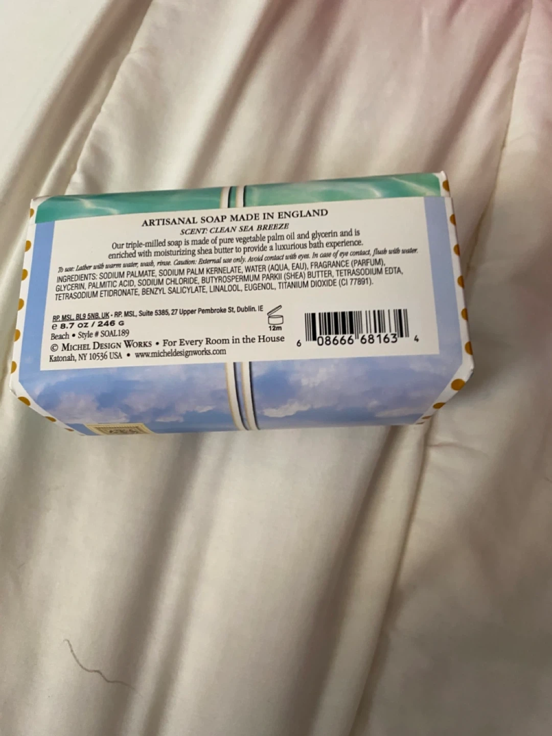 Artisanal soap made in England with the scent of a clean sea breeze. It's enriched with moisturizing shea butter to provide a luxurious bath experience. Formulated with pure vegetable palm oil and glycerin.