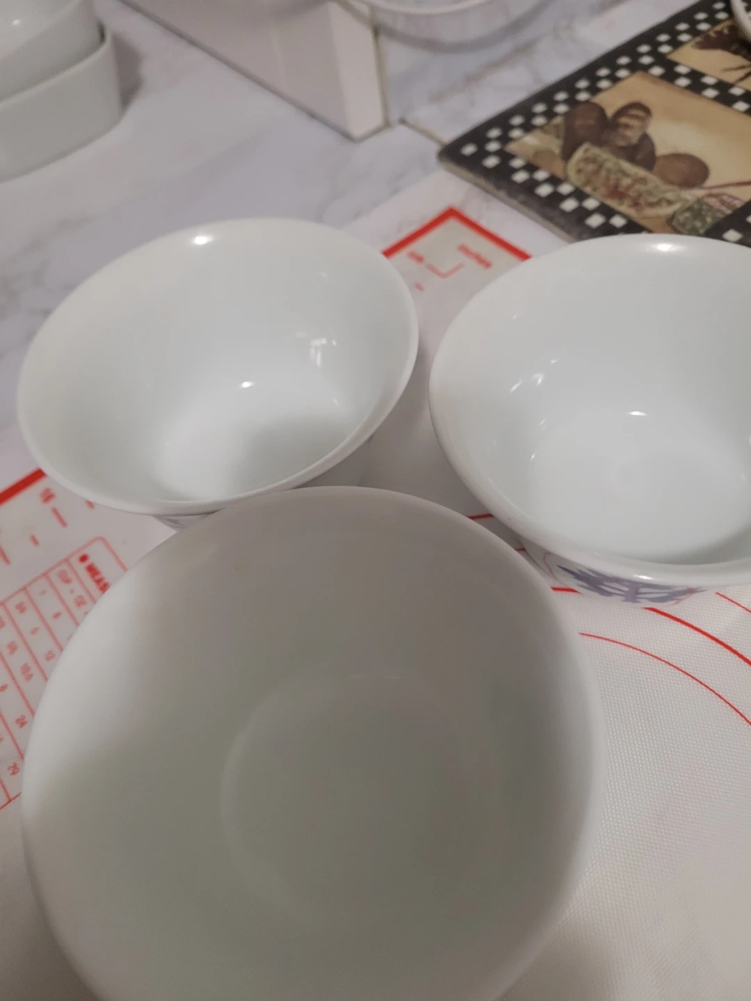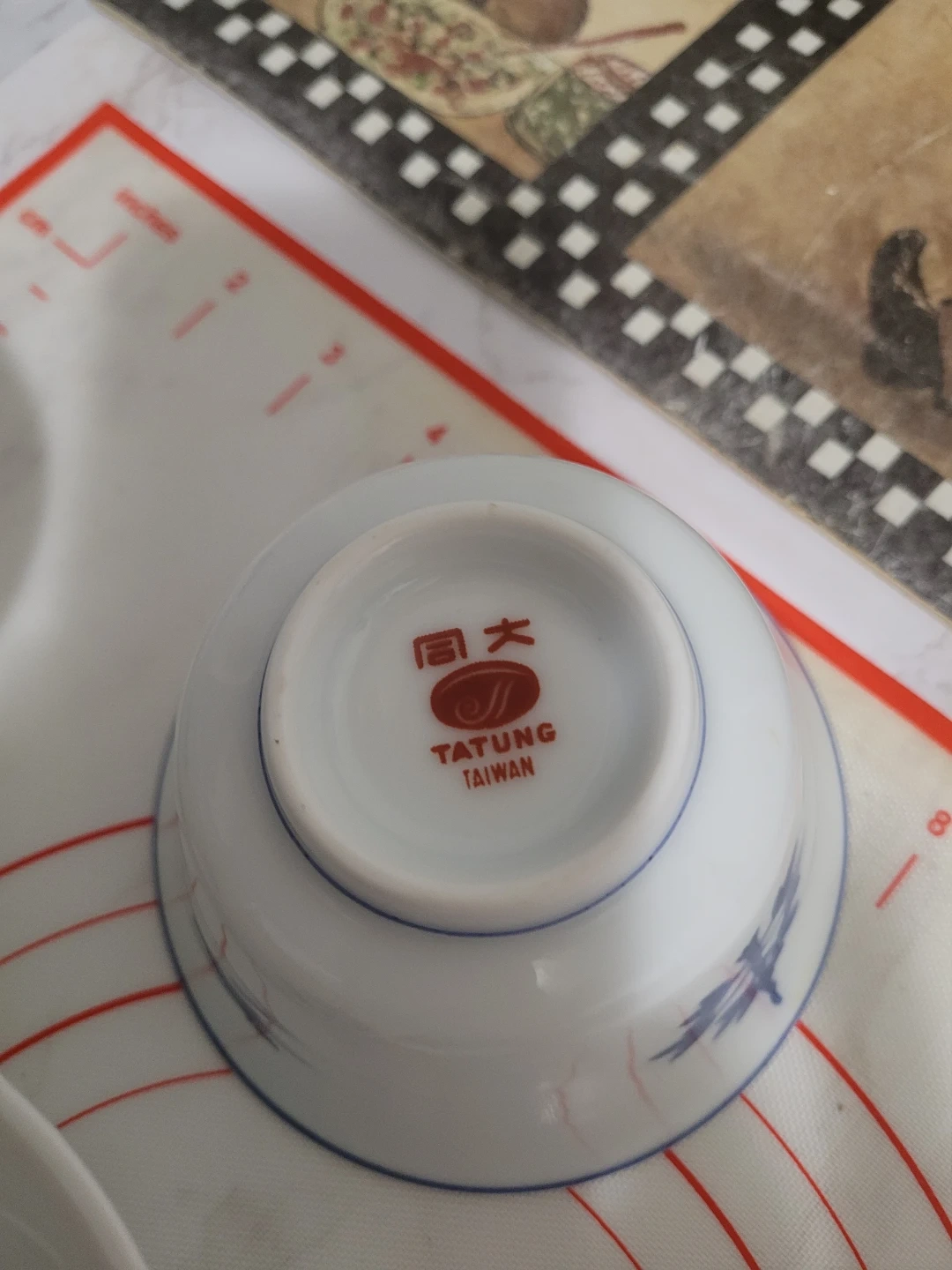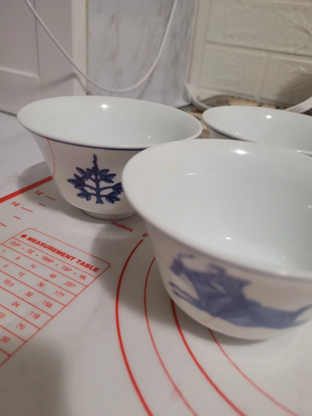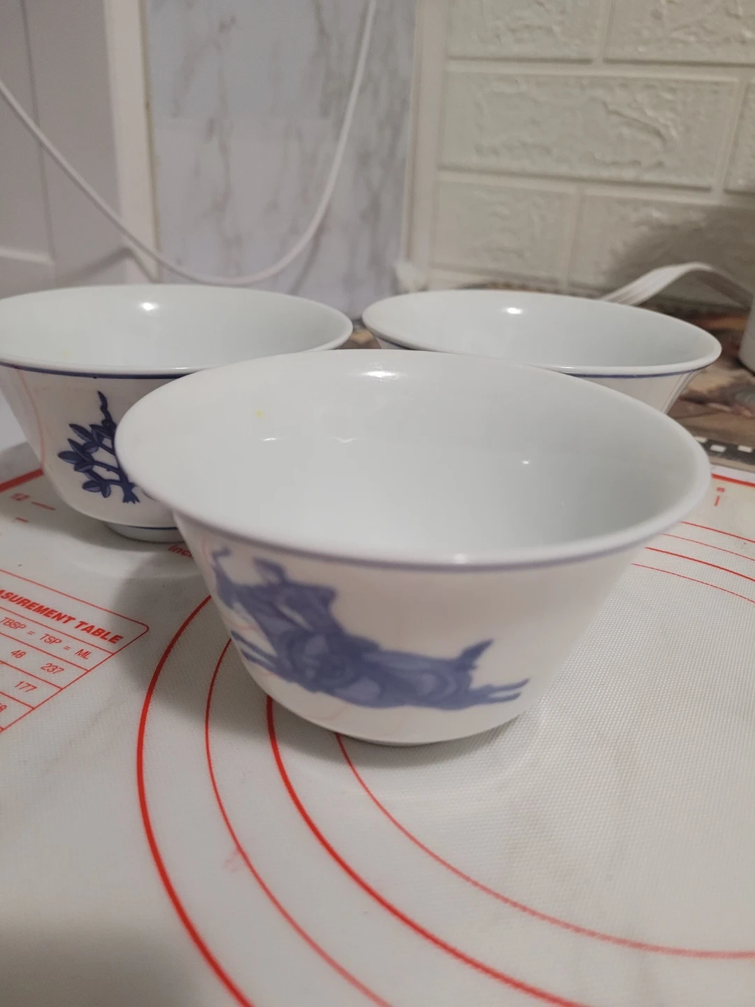 Set of three Tatung brand porcelain bowls from Taiwan. Each bowl features a blue decorative pattern on a white background. White porcelain material. It's elegant and good for soups and yugort.