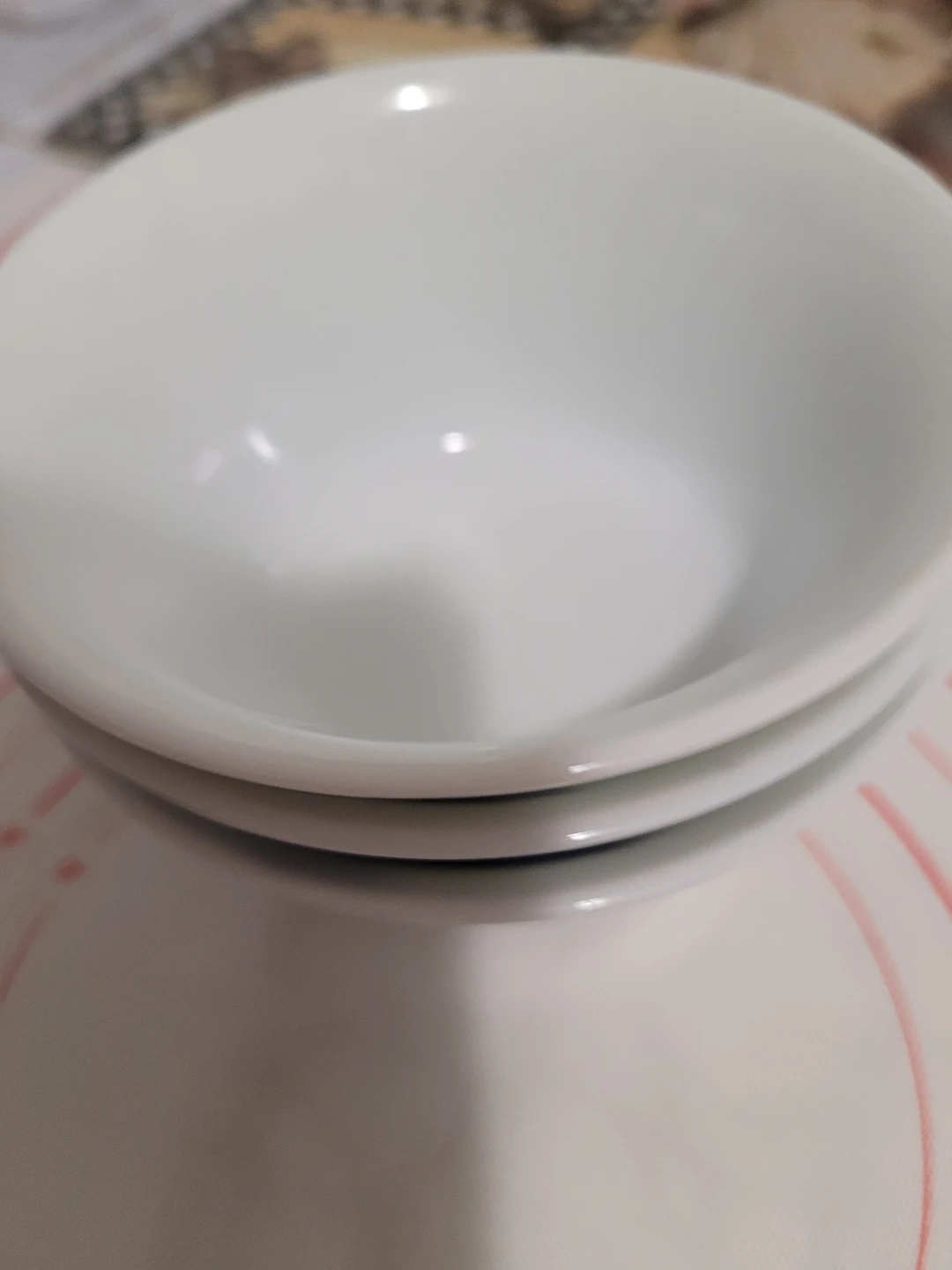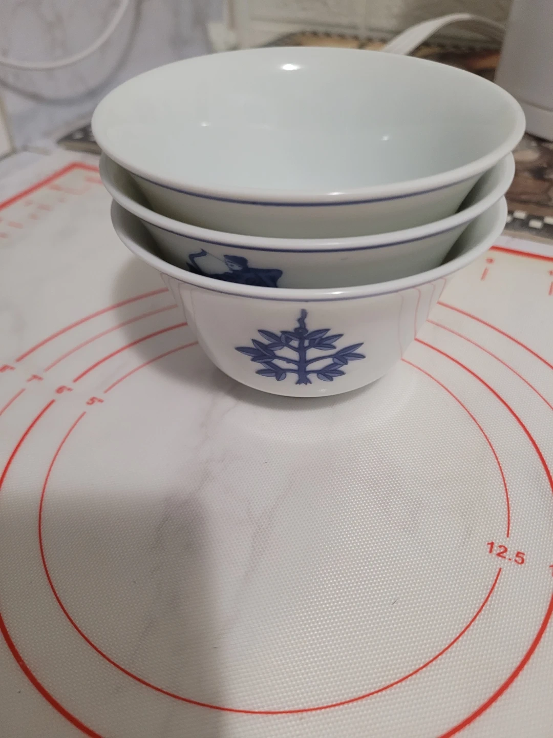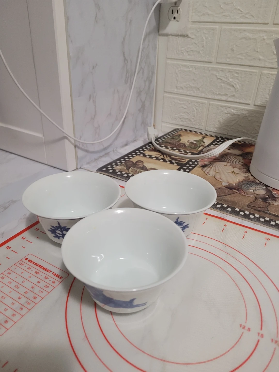 Set of three Tatung brand porcelain bowls from Taiwan. Each bowl features a blue decorative pattern on a white background. White porcelain material. It's elegant and good for soups and yugort.