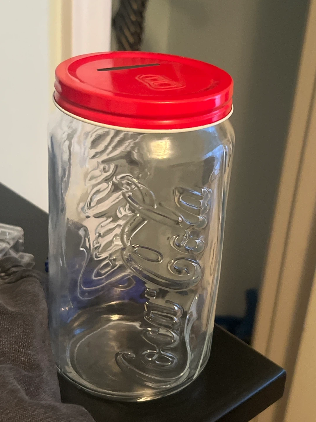Selling a Coca-Cola coin bank. It's a glass jar with the Coca-Cola logo embossed on the side and a red metal lid with a coin slot. Perfect for saving your spare change!