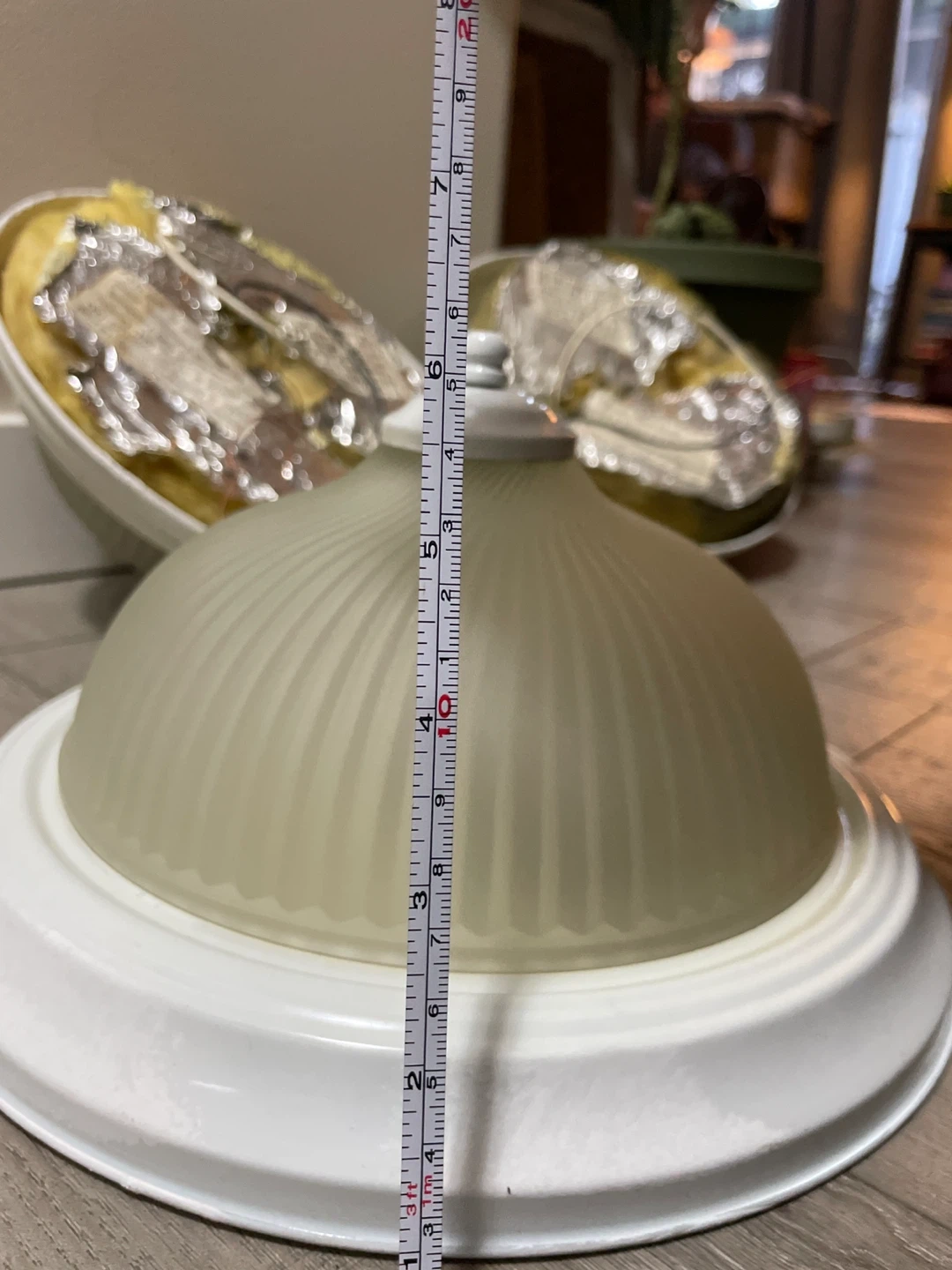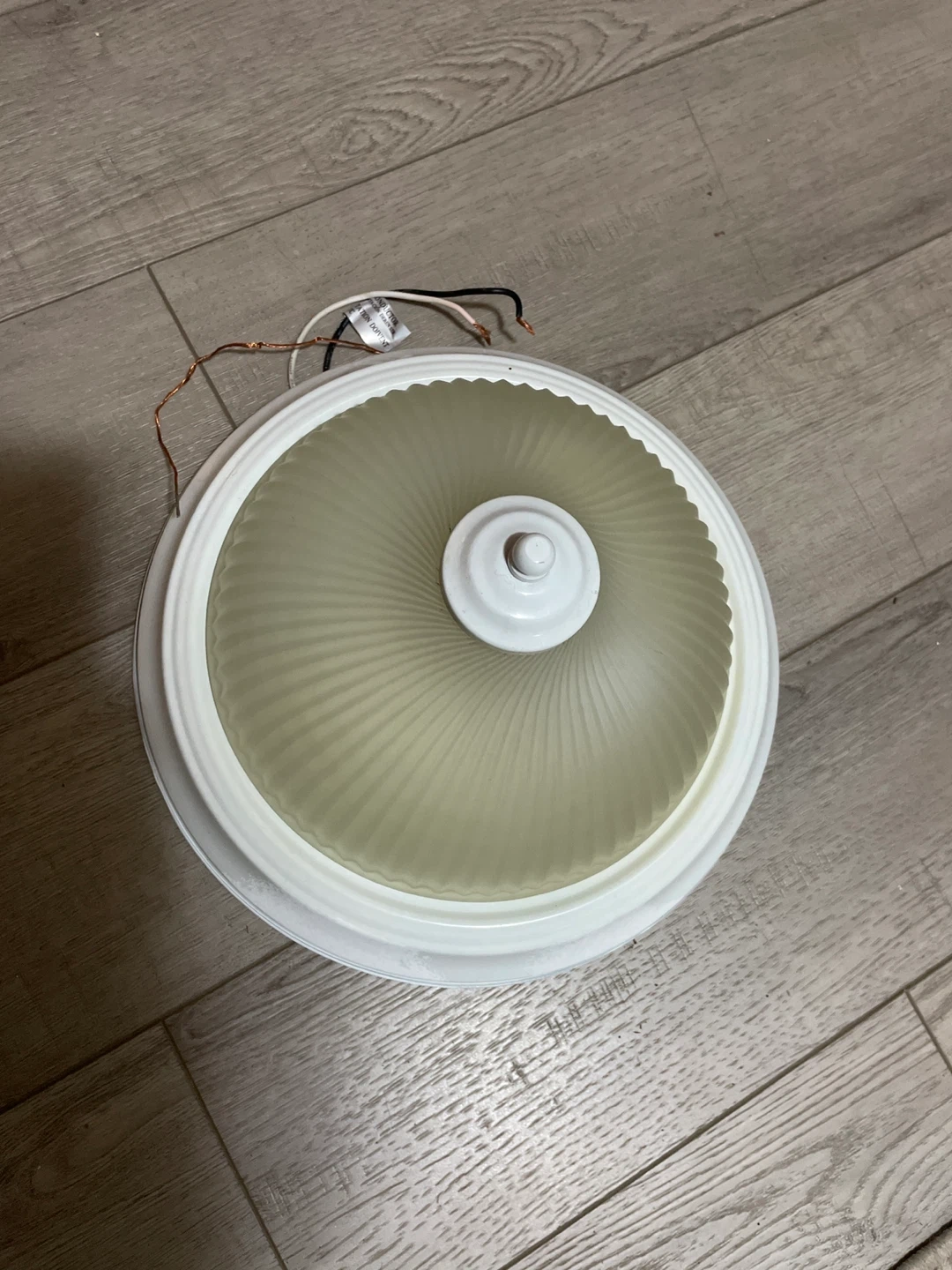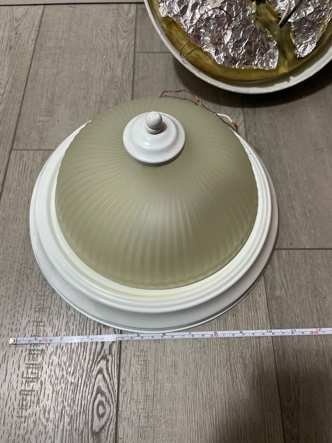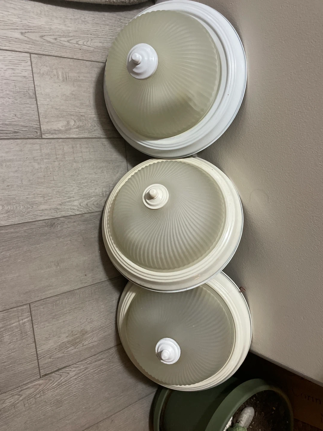 Selling three white flush mount ceiling light fixtures with frosted glass shades. Each fixture measures approximately 12 inches in diameter and 5 inches in height. Wiring is included for installation. These would be great for any room needing updated lighting!