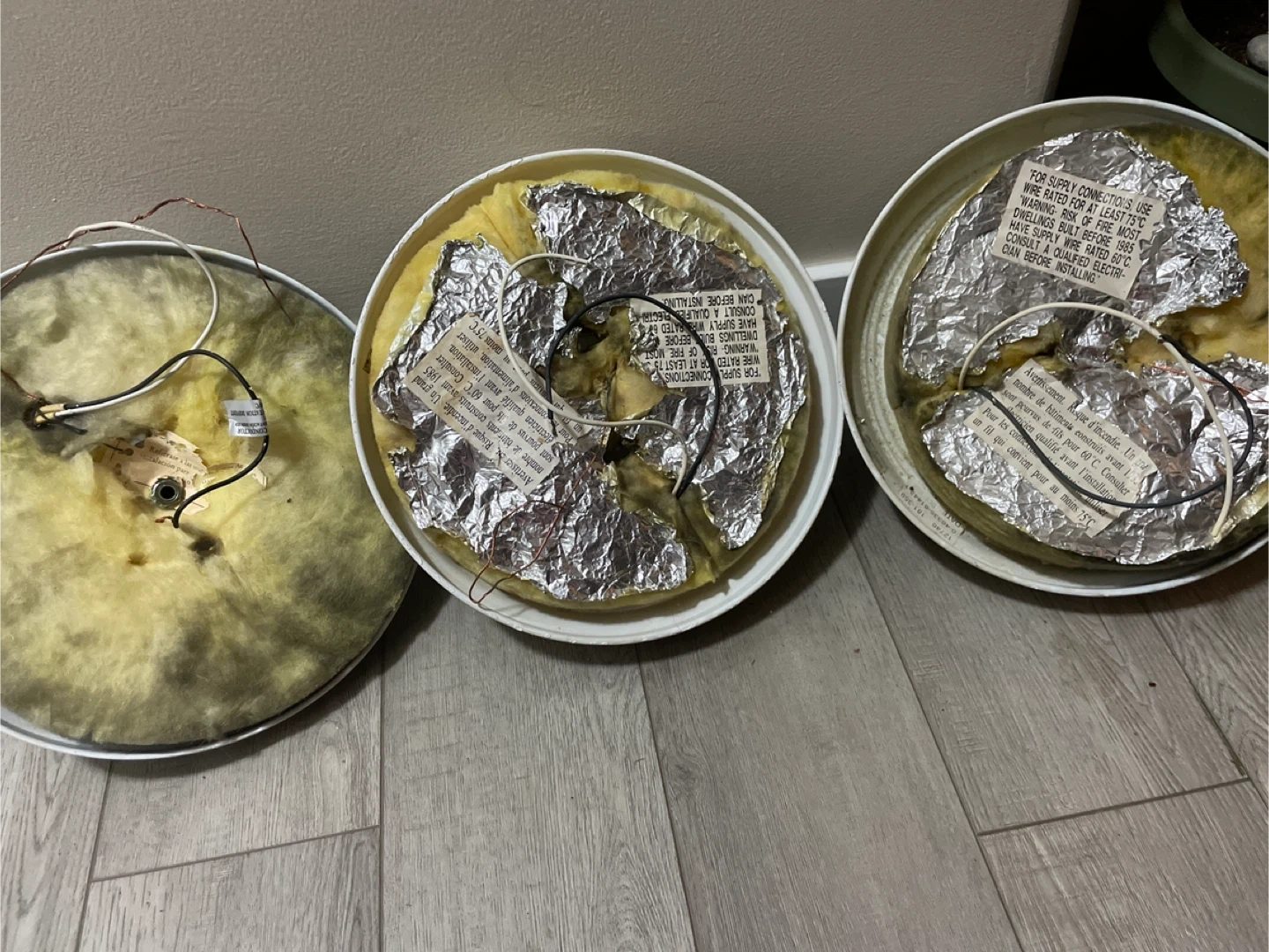 Selling three white flush mount ceiling light fixtures with frosted glass shades. Each fixture measures approximately 12 inches in diameter and 5 inches in height. Wiring is included for installation. These would be great for any room needing updated lighting!