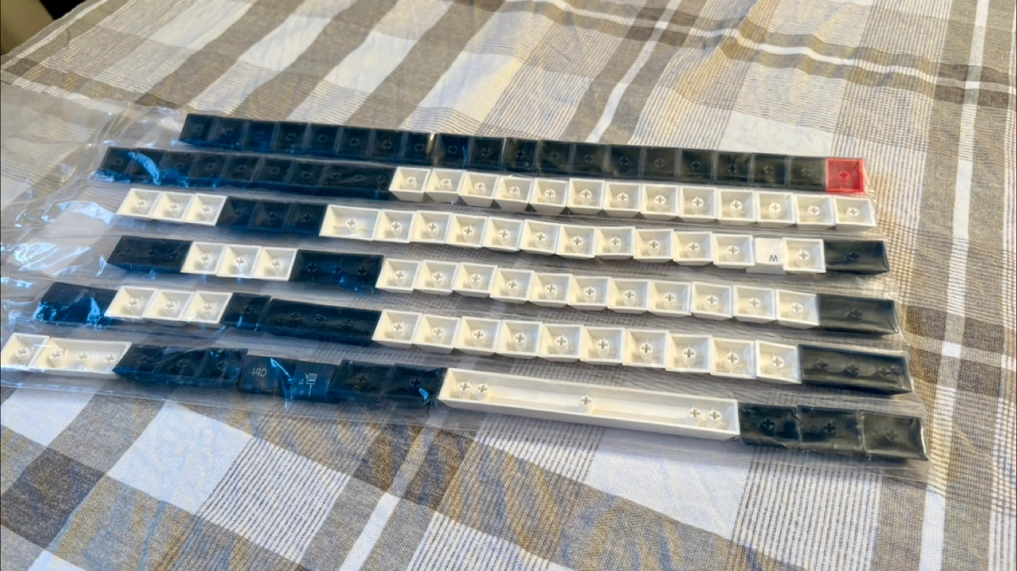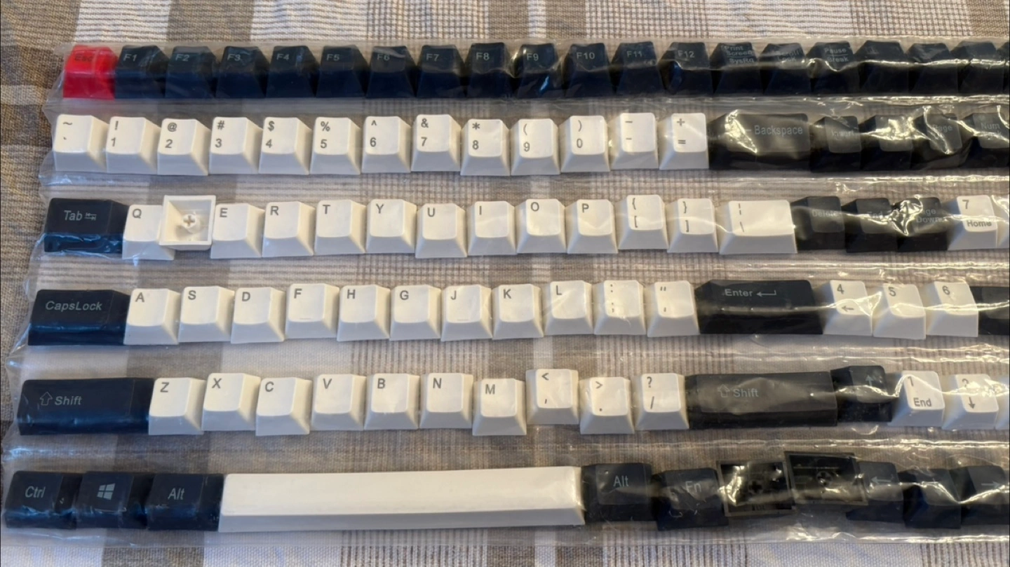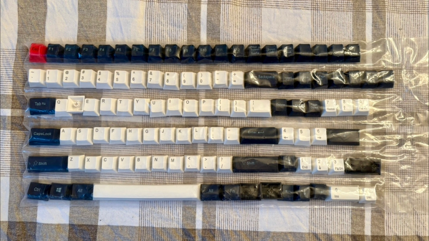 Navy colour scheme, white and blue keycaps with black lettering. Includes all keys.