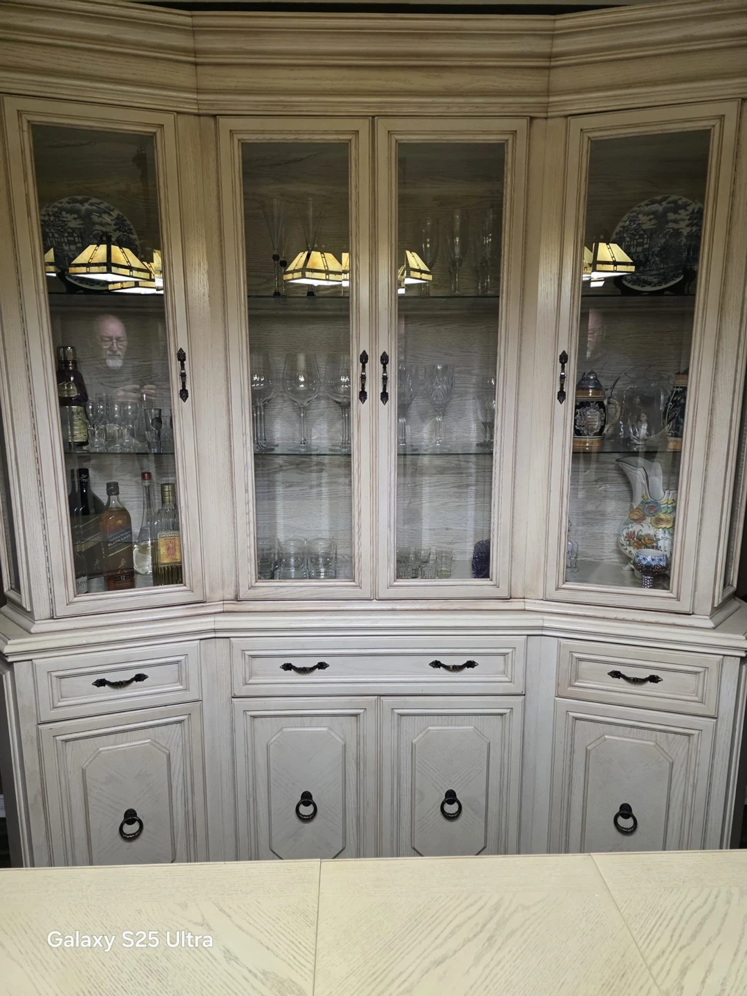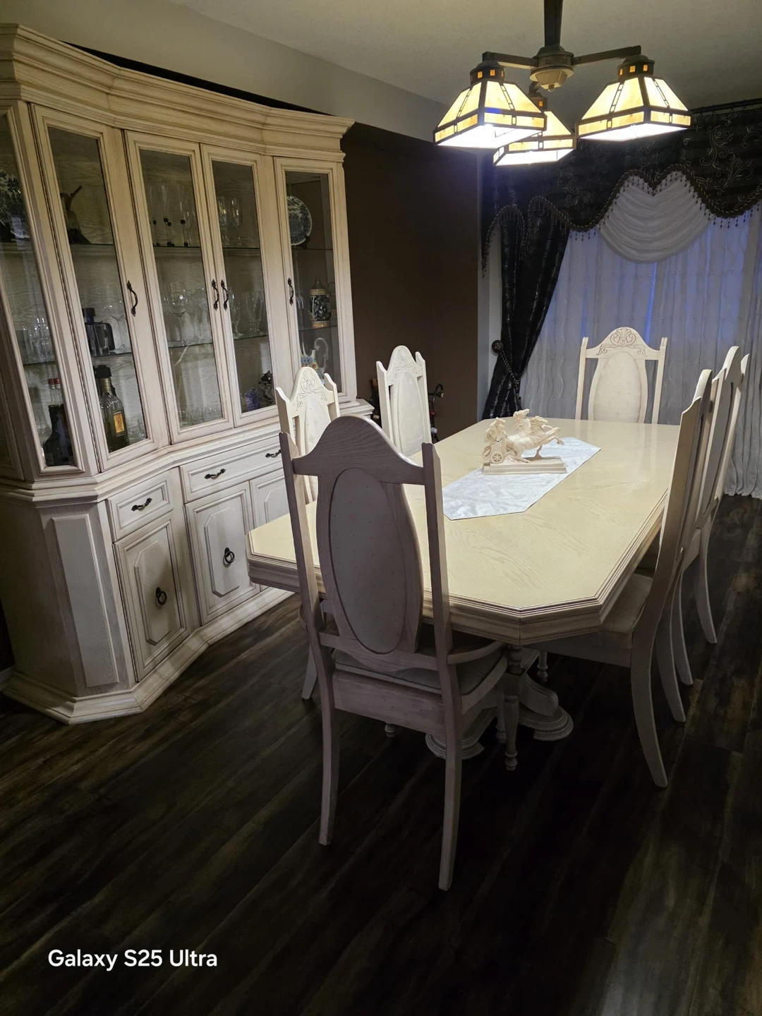 This cream-coloured dining set includes a china cabinet with glass doors and drawers, along with a matching dining table and chairs. The china cabinet offers ample display and storage space for your dinnerware and decorative items. The table features an elegant design, suitable for hosting family meals or dinner parties.