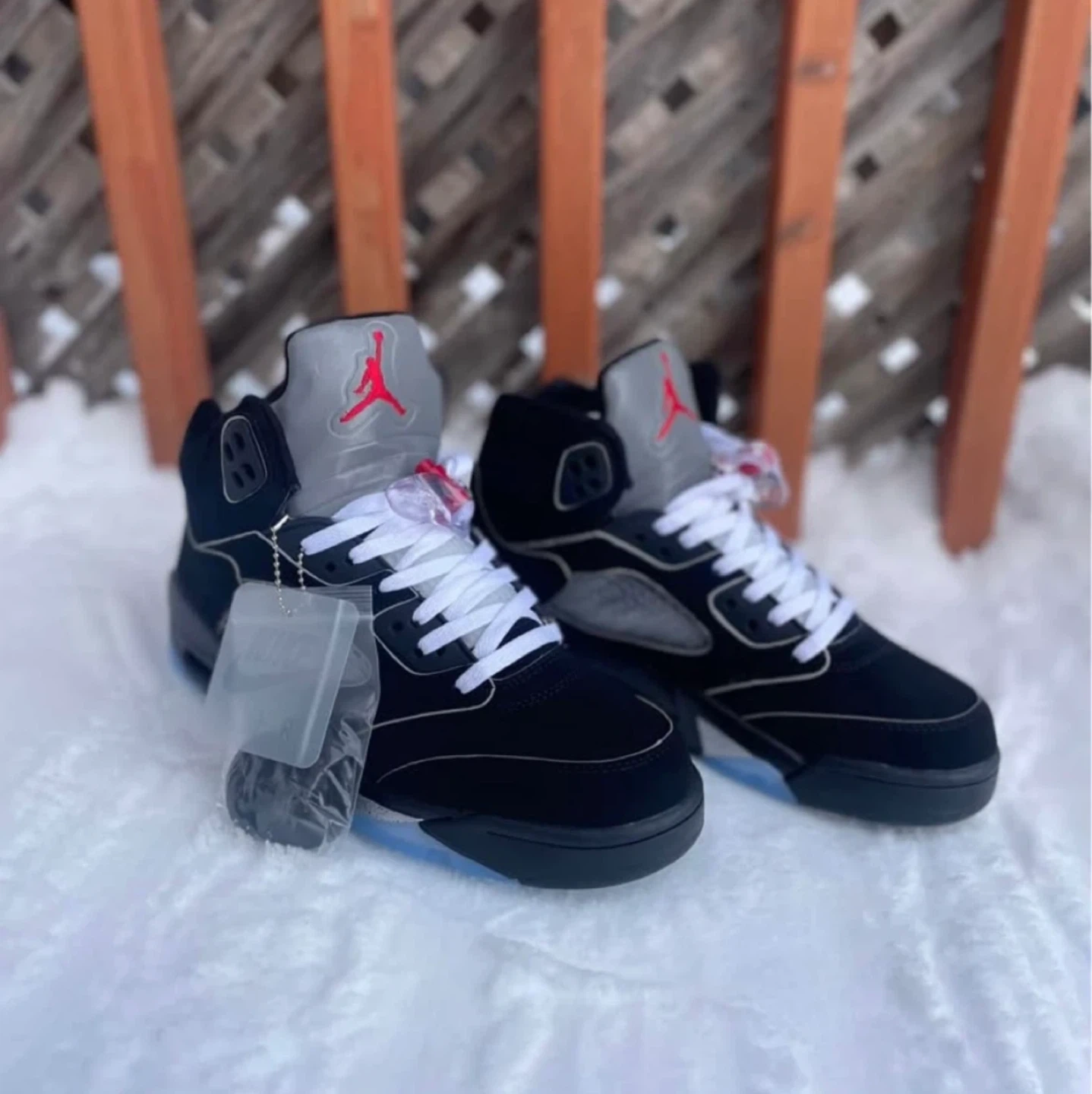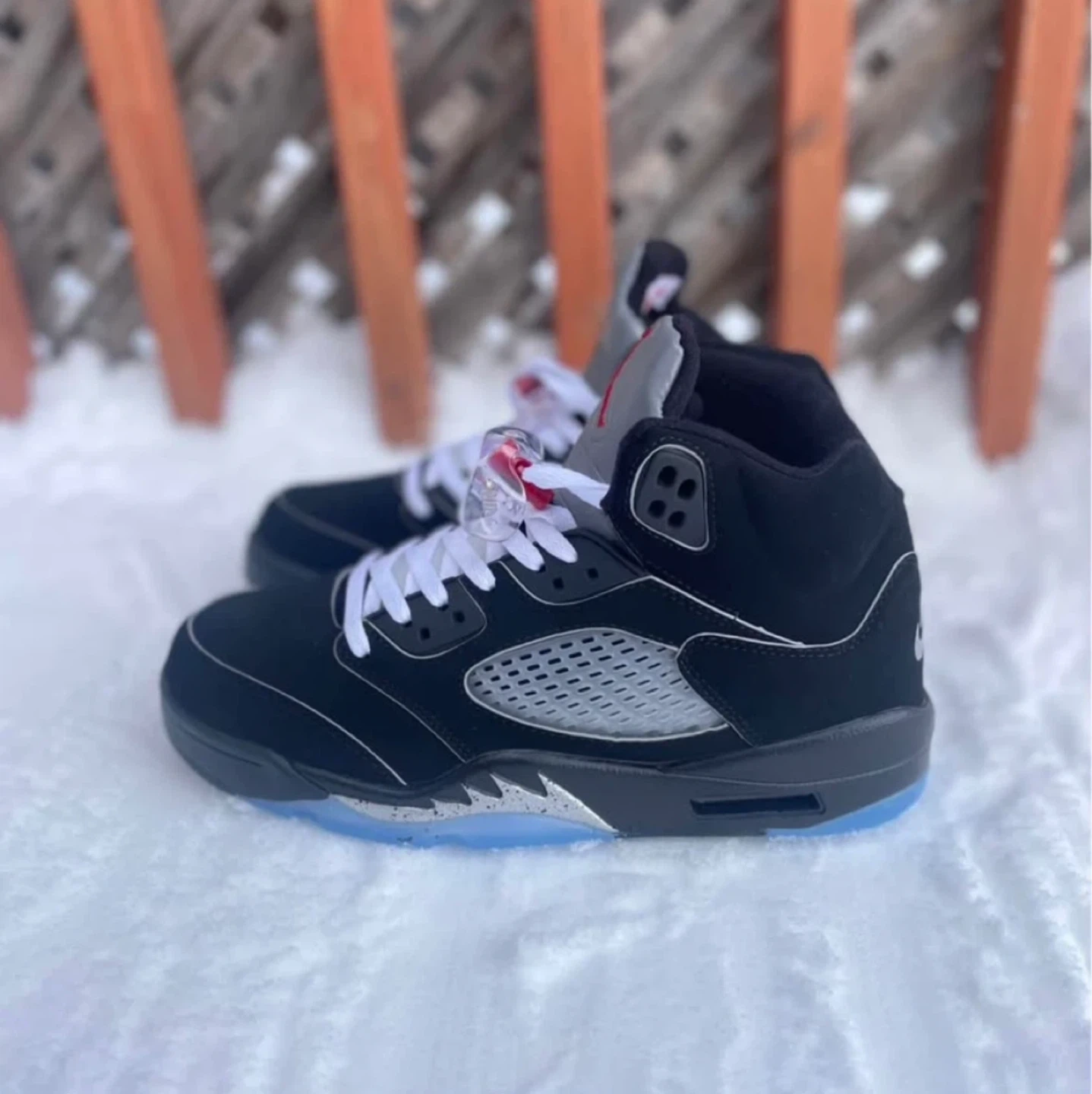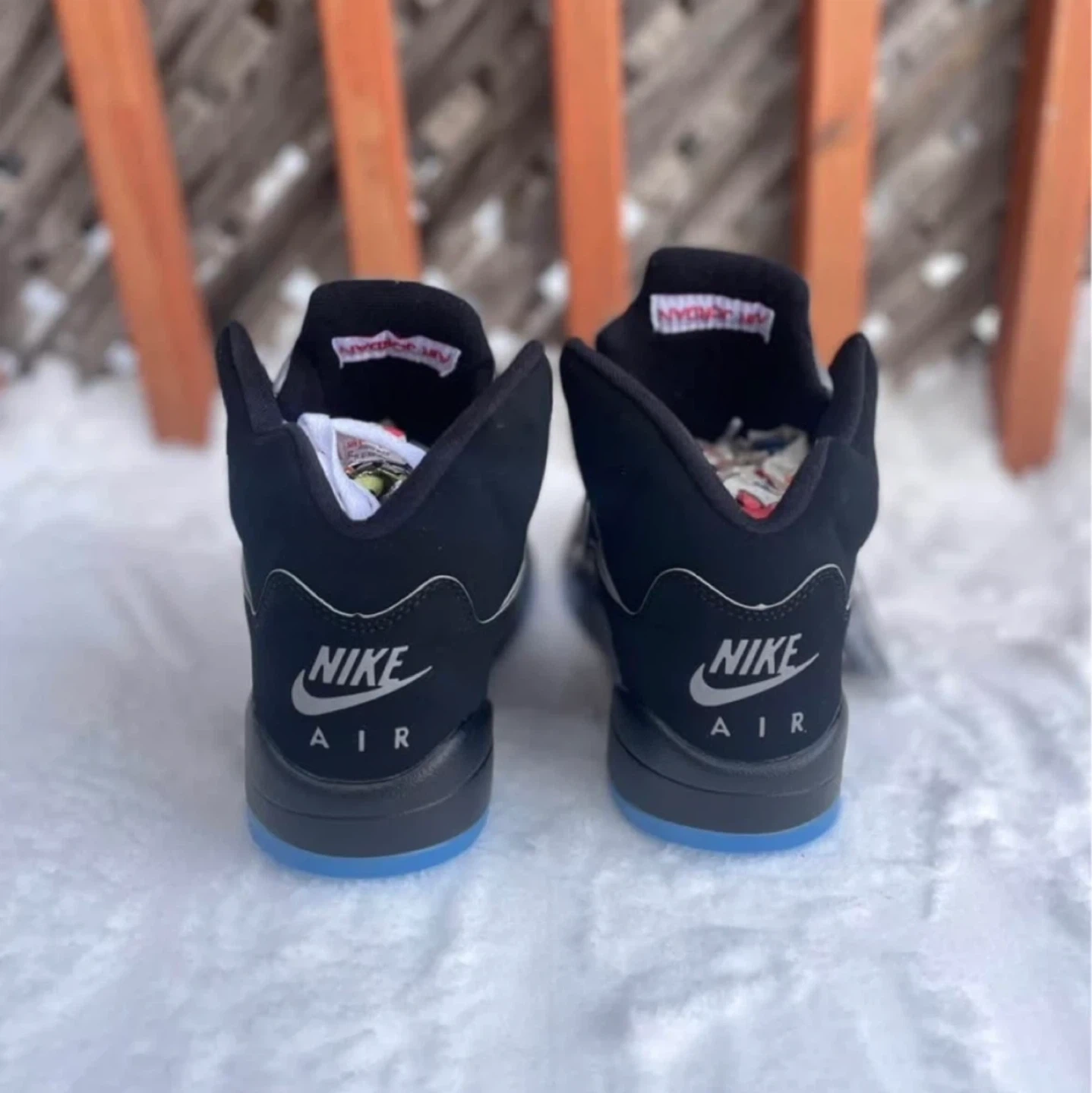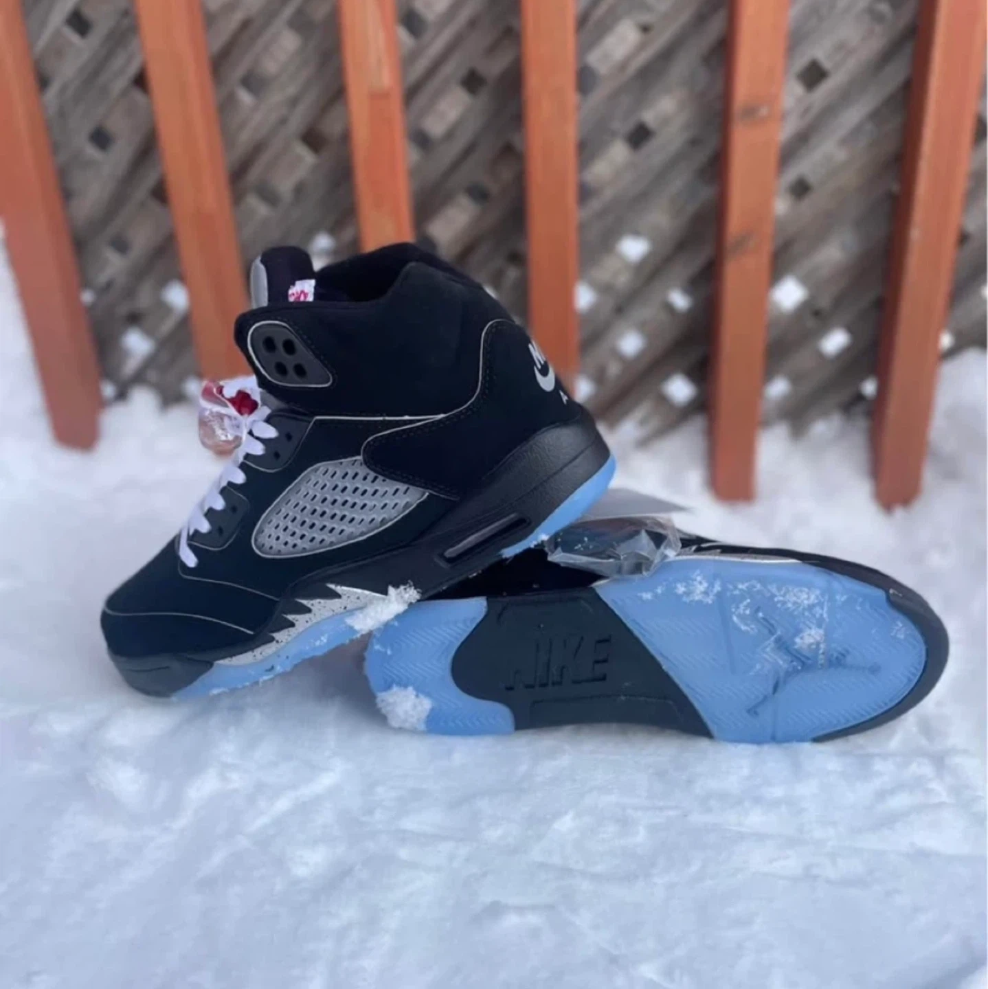 Classic Air Jordan 5 Retro sneakers in black and gray. These mid-top shoes feature a translucent icy blue outsole and white laces. Includes original tags.