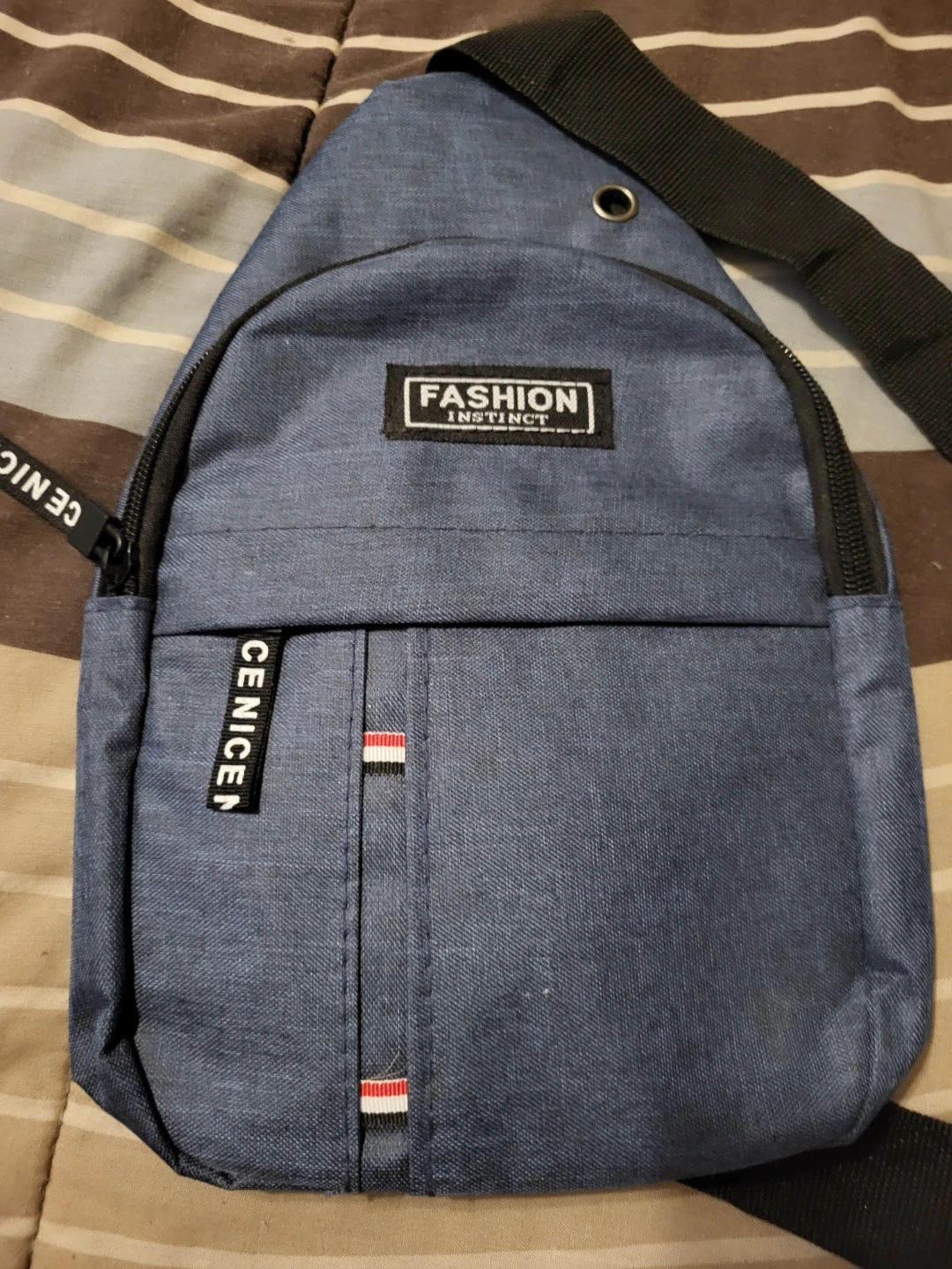 This is a blue sling bag from Fashion Instinct. It's made of a durable fabric material. The bag features a zippered main compartment and an exterior pocket.