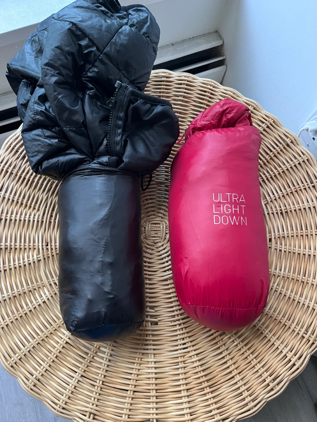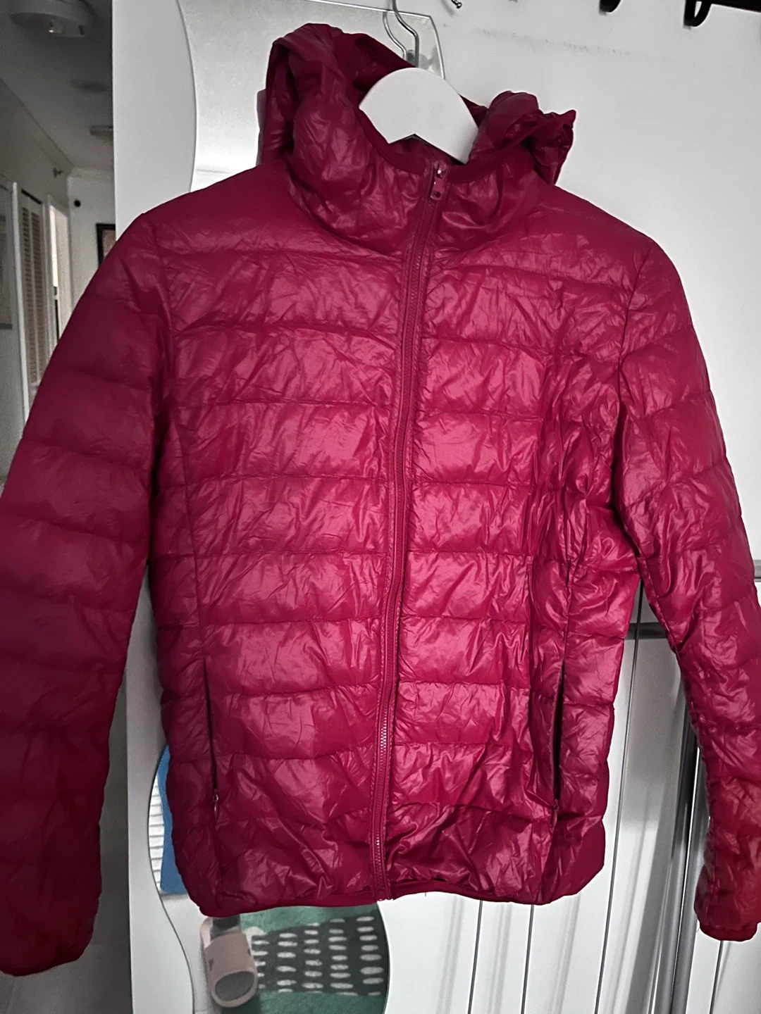 Women’s Black and Red. Uniqlo Ultra Light Down jacket in black and berry red. It's a packable puffer coat that comes with its own stuff sack. Lightweight and warm for cooler weather!