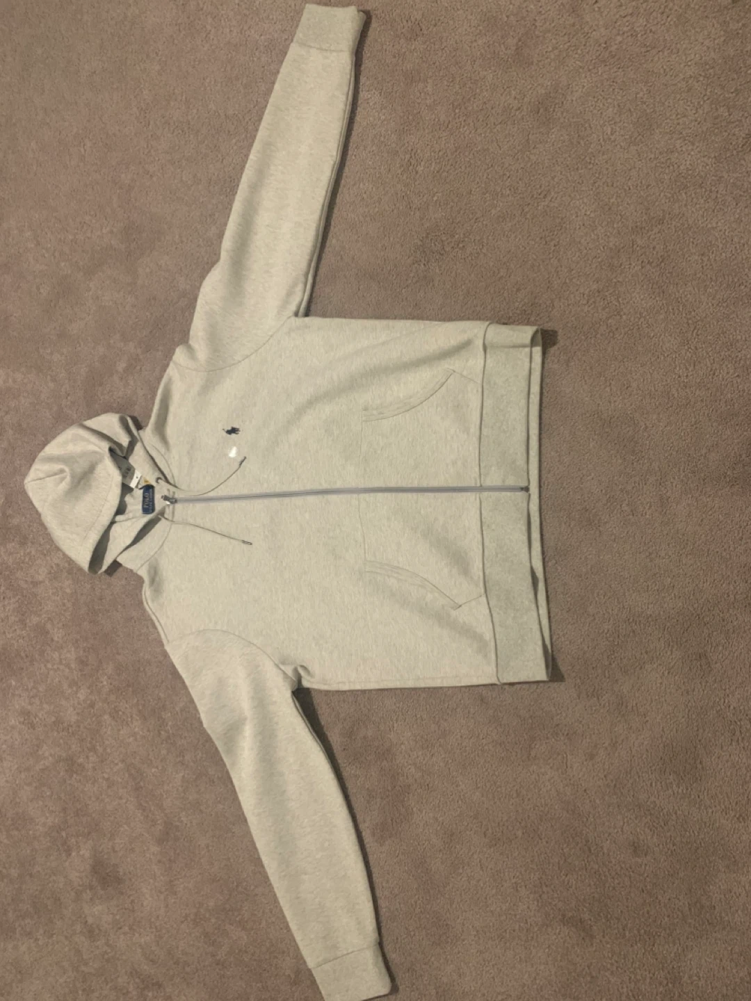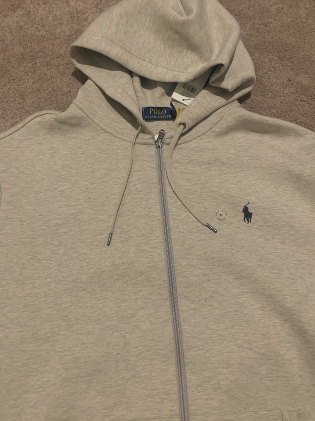 This is a Polo Ralph Lauren full-zip hoodie in size XL but fits like a Large. It's a grey heather colour. Payed 200+ Authentic. Never worn.